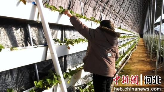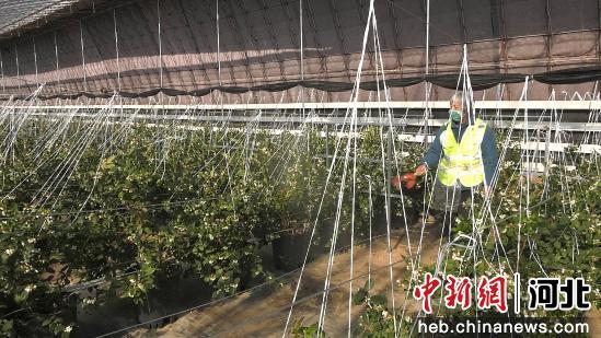 工作人員正在對(duì)溫室的草莓進(jìn)行管護(hù)。 趙健光 攝