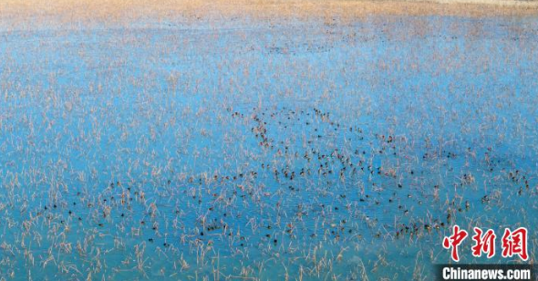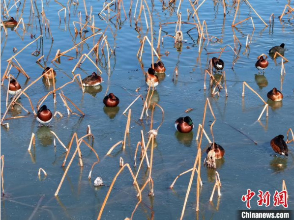 中新社衡水1月16日電 (裴國榮 崔志平 張凱)“這次拍攝到的青頭潛鴨集群經過確認達到120只,是2018年以來衡水湖觀測到的最大種群?!?6日,河北衡水濱湖新區資源保護局濕地生態監測科科長張余廣稱。
