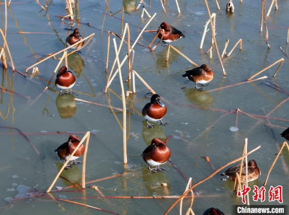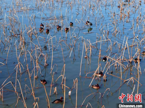 圖為1月15日,青頭潛鴨和其它鴨類在湖面休憩。 張學鋒 攝