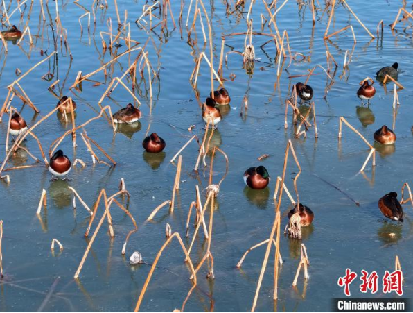 圖為1月16日,大量青頭潛鴨和其它鴨類在湖面休憩。 王鐵良 攝