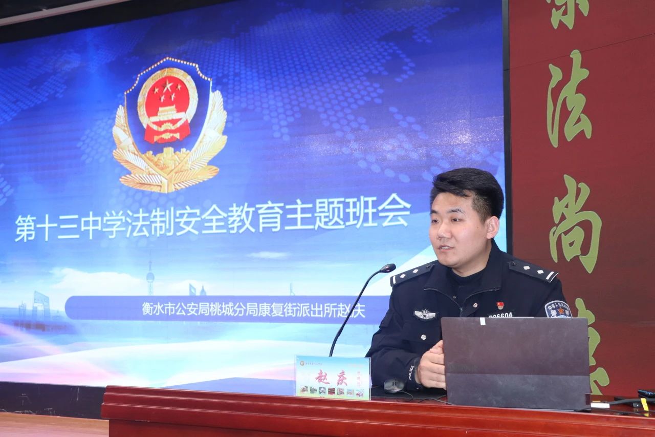 為進一步增強未成年人法律意識,保護未成年人健康成長,提高學生的思想道德水平和法律素養(yǎng),近日,衡水十三中組織開展了“法治之光耀校園 德法兼修育新人”主題宣傳教育活動。本次活動特邀衡水市康復街派出所具有豐富經驗的民警趙慶擔任主講老師,他為同學們普及了一系列實用的法律知識,讓法治走進校園,助力同學們了解法律知識、筑牢法治意識。