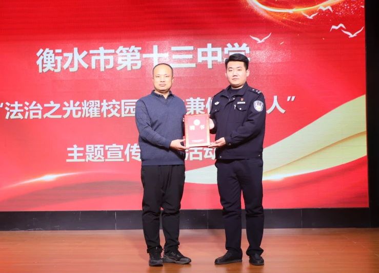 衡水十三中黨委委員、紀委書記劉學通為趙慶警官頒發(fā)了“衡水市第十三中學法治指導教師”聘書。