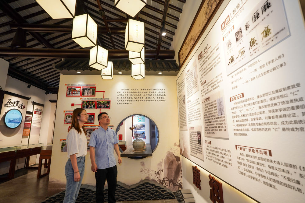參觀者在蘇州市吳江區平望鎮廉潔教育基地鶯湖廉園內參觀(2024年7月4日攝)。新華社記者 李博 攝