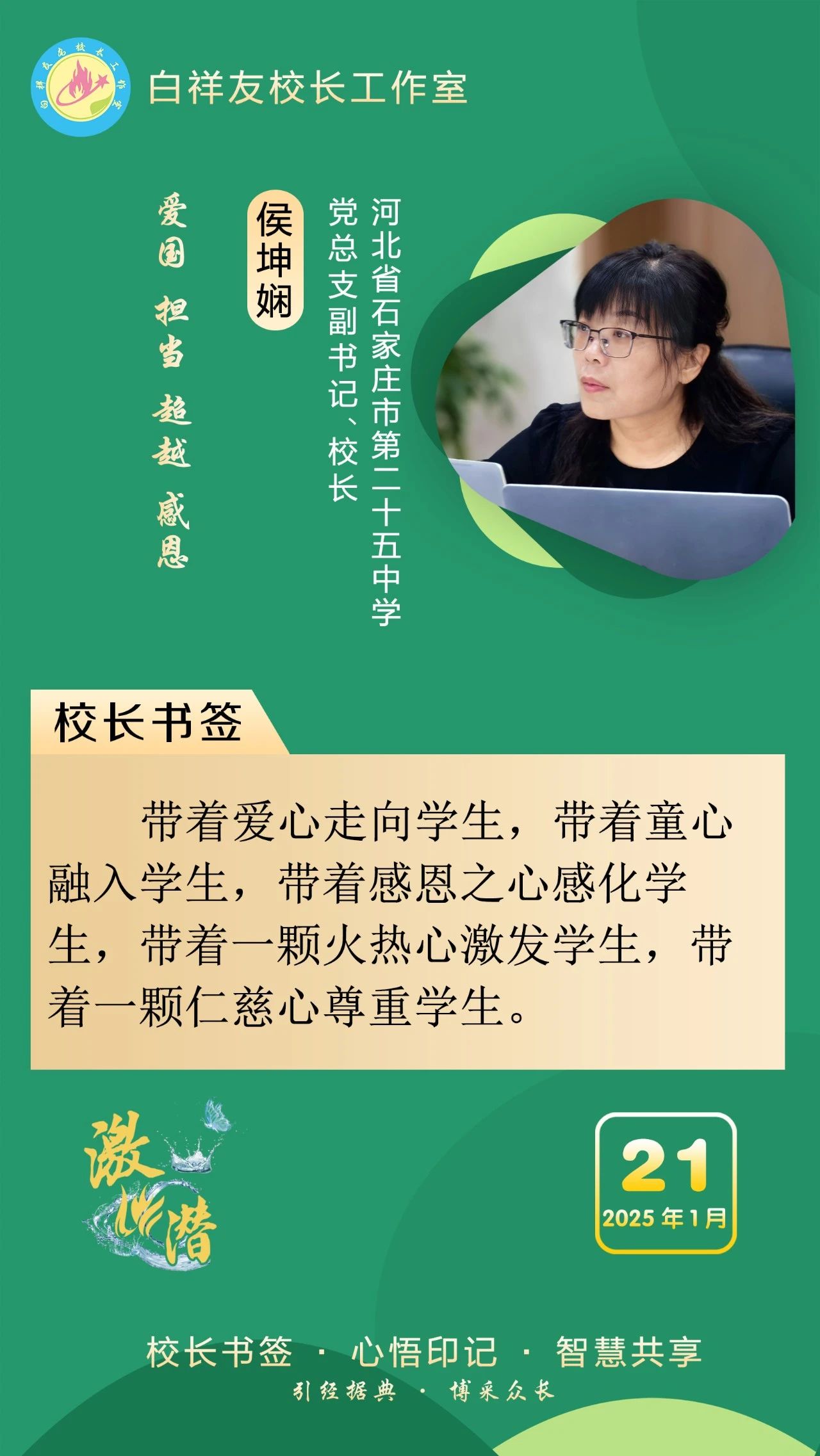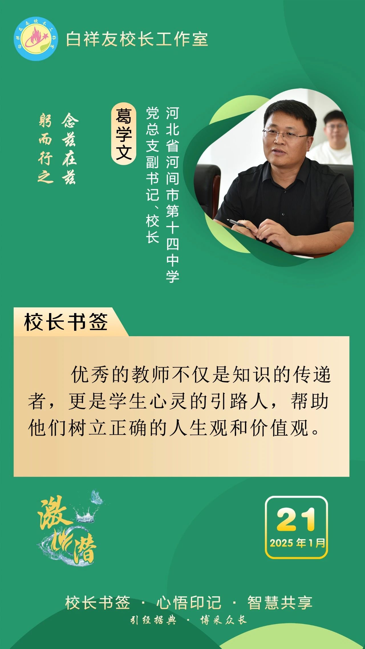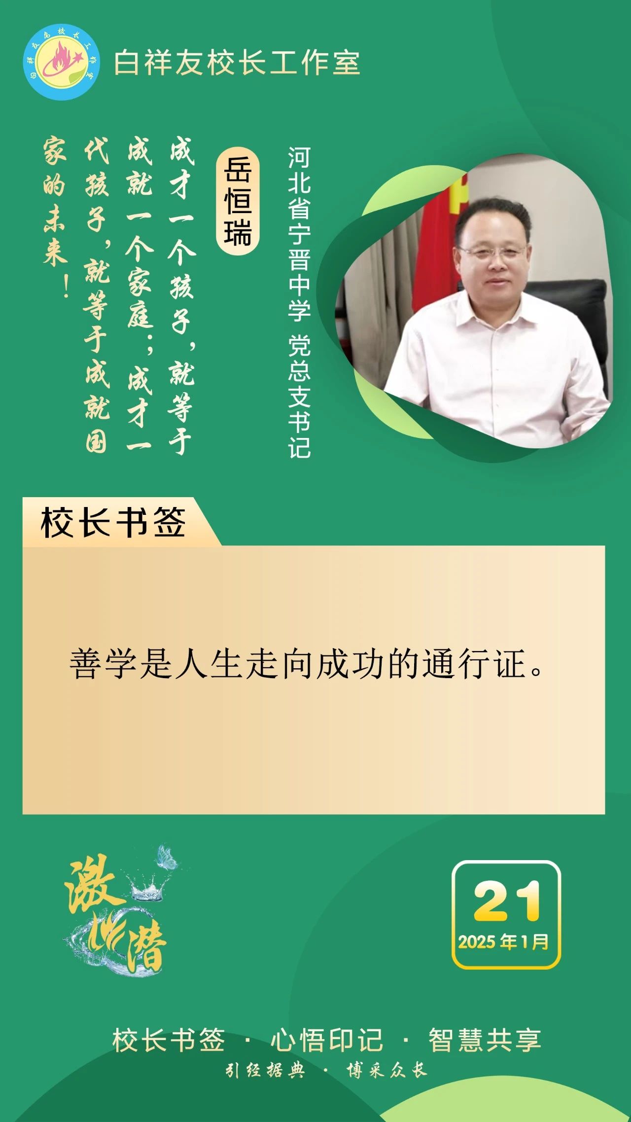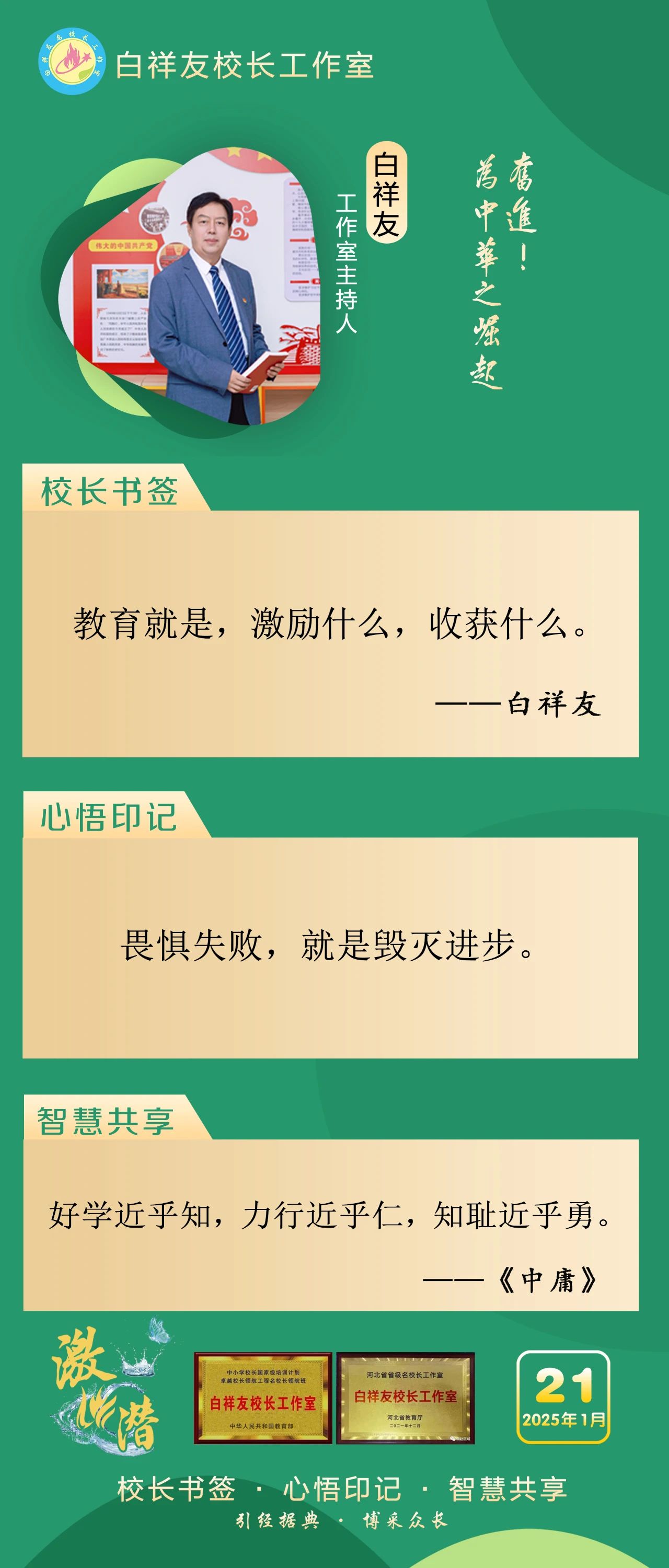 “白祥友校長工作室”成立于2019年4月,是教育部“國培計劃”中小學名校長領航工程、河北省首批名校長工作室,目前省內外成員校56個。工作室堅持“資源共享、智慧共融、互助共贏”理念,已成為思想碰撞的交流場,資源共享的品牌站,成果展示的輻射源。