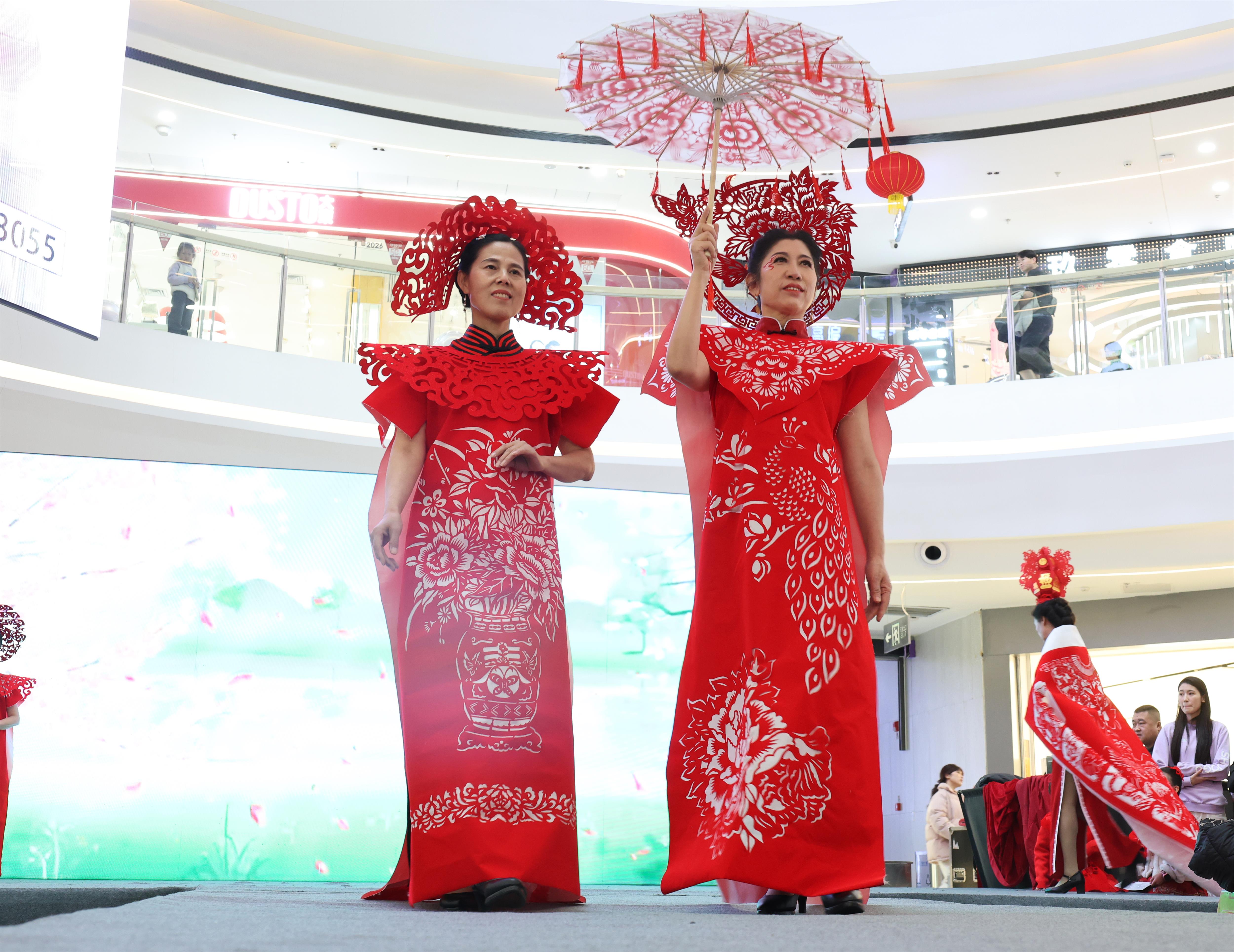 隨后,成人剪紙服裝展示環(huán)節(jié)將現(xiàn)場氣氛推向了高潮。一名名模特自信地邁著步伐,身著融入傳統(tǒng)剪紙元素的服裝,緩緩向觀眾走來。從精巧的云肩到長達5米的拖地剪紙長裙,每一件服飾都繡著非遺剪紙藝術作品,這些作品在模特的演繹下活靈活現(xiàn),在舞臺上綻放出別樣光彩。臺下觀眾,紛紛拿出手機記錄下這精彩瞬間。