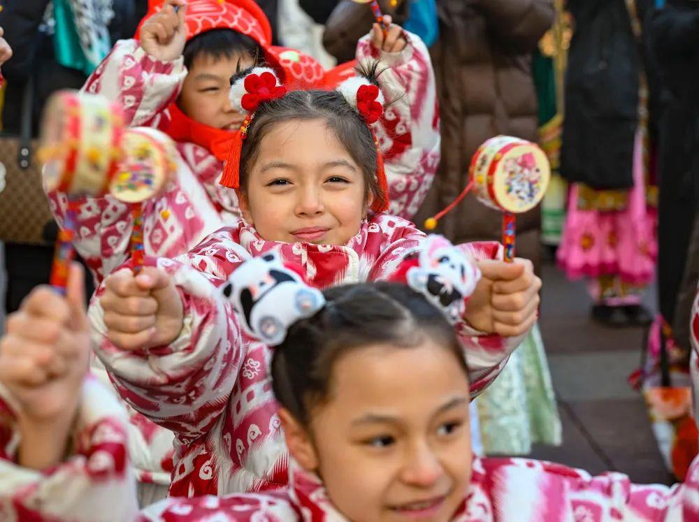 △新疆大巴扎社火迎新春,孩子們在現場表演。