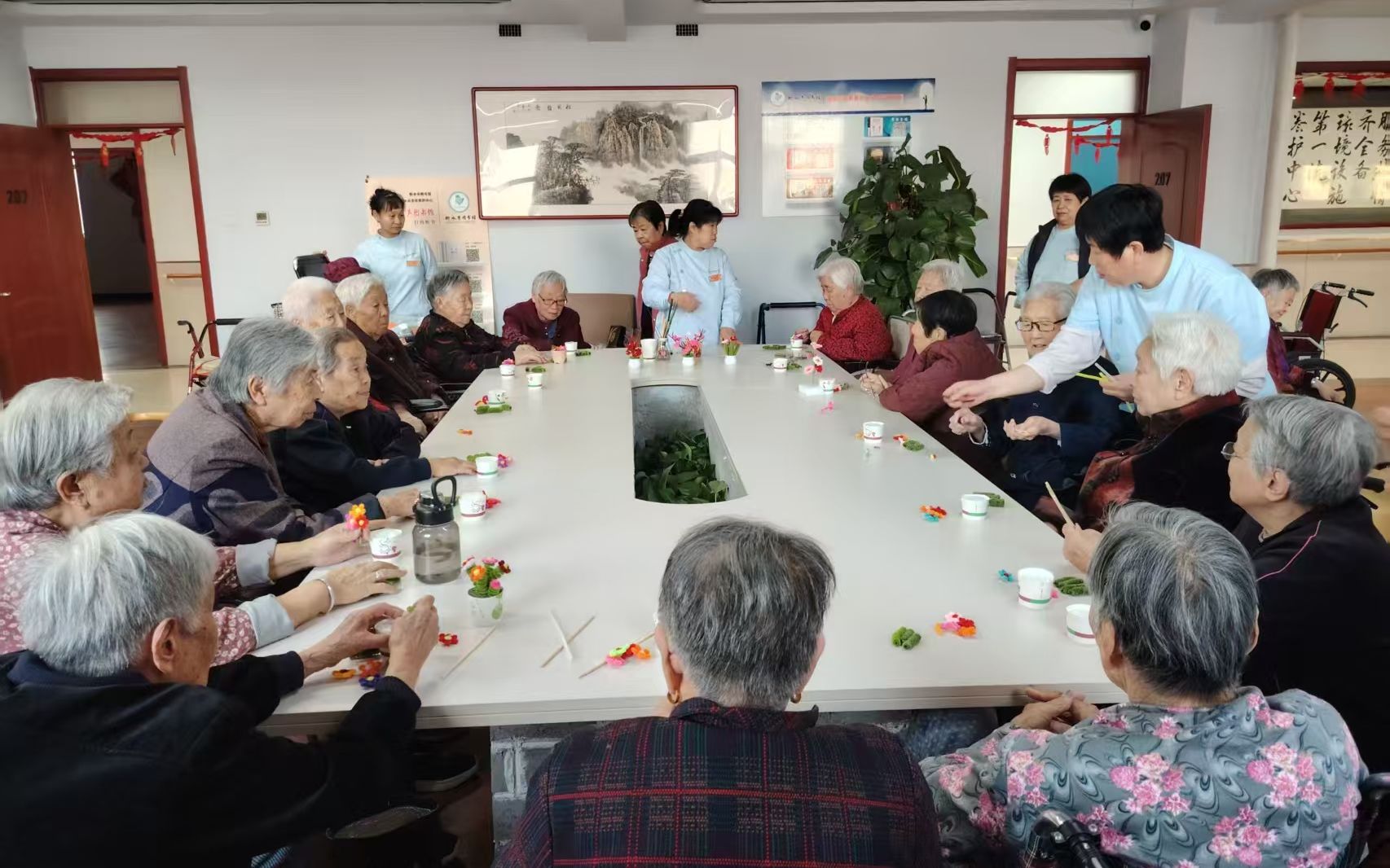 為了增添更多年味,讓老人們感受到濃濃的節(jié)日氛圍,該中心提前張燈結(jié)彩、裝飾一新,護(hù)理員和工作人員在門窗上貼春聯(lián)福字,帶領(lǐng)老人們做手工扎花,為老人們表演自編自導(dǎo)的文藝節(jié)目。年夜飯,準(zhǔn)備了餃子、蒸魚、小雞燉蘑菇等,老人們圍坐桌邊,笑語歡聲不斷。