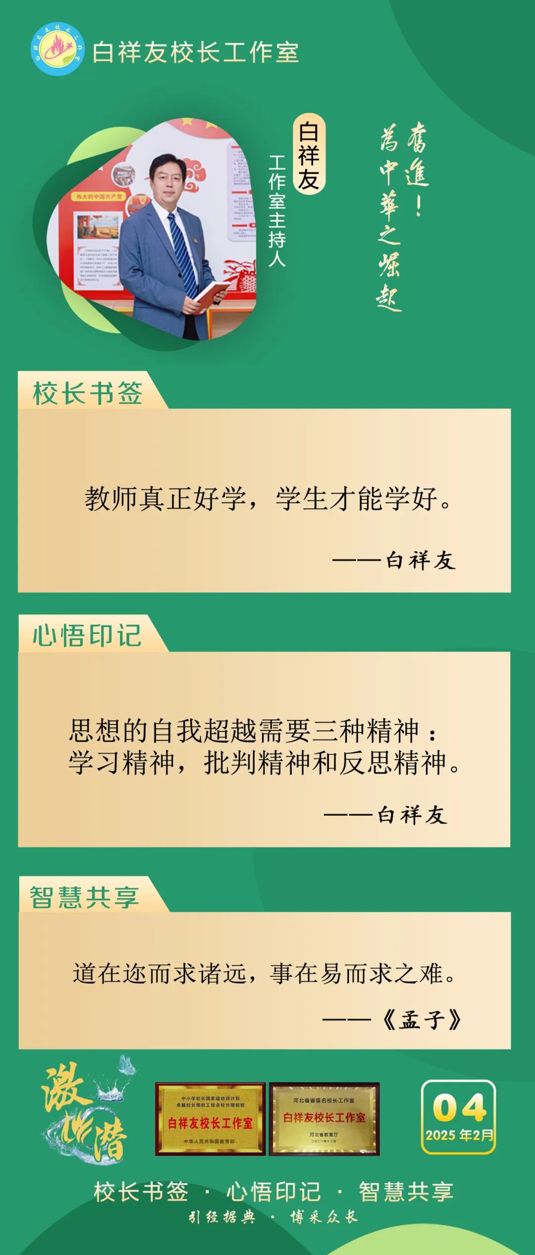 “白祥友校長工作室”成立于2019年4月,是教育部“國培計劃”中小學名校長領航工程、河北省首批名校長工作室,目前省內外成員校56個。工作室堅持“資源共享、智慧共融、互助共贏”理念,已成為思想碰撞的交流場,資源共享的品牌站,成果展示的輻射源。