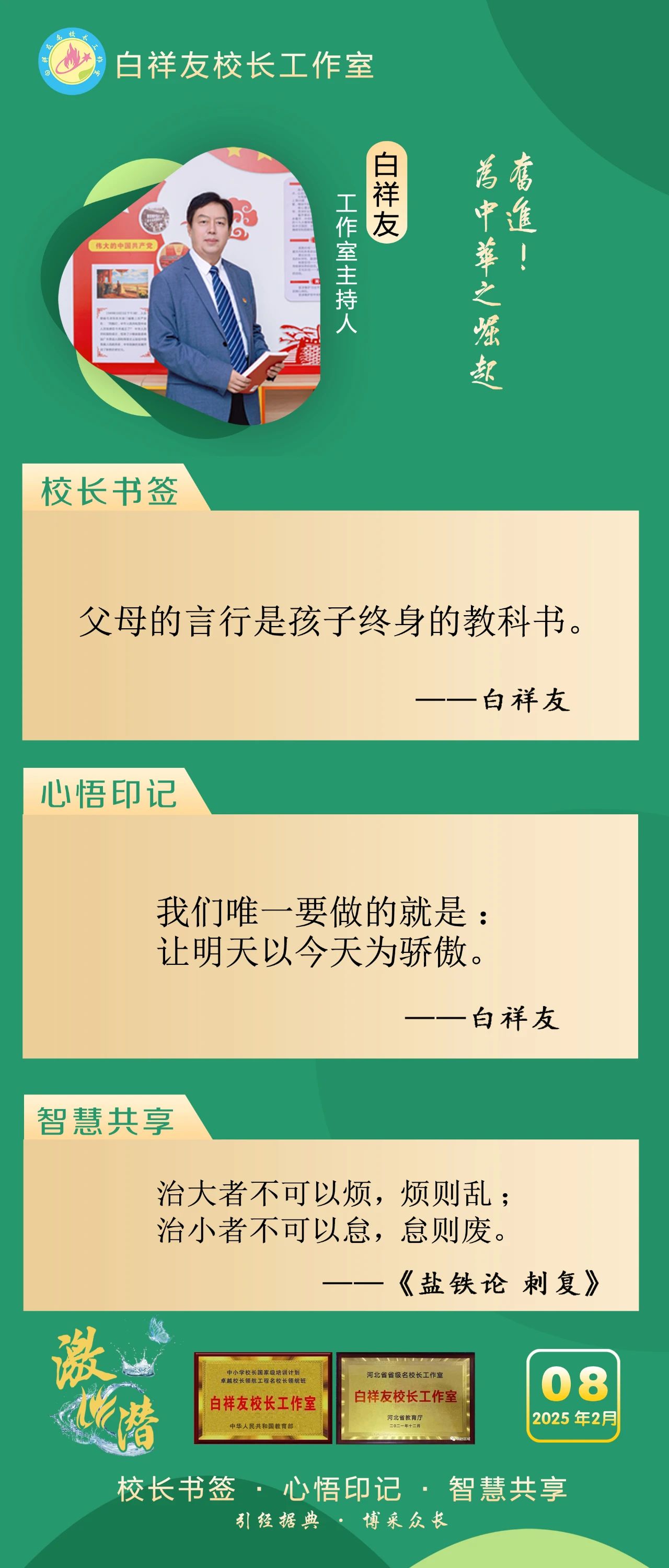 “白祥友校長(zhǎng)工作室”成立于2019年4月,是教育部“國(guó)培計(jì)劃”中小學(xué)名校長(zhǎng)領(lǐng)航工程、河北省首批名校長(zhǎng)工作室,目前省內(nèi)外成員校56個(gè)。工作室堅(jiān)持“資源共享、智慧共融、互助共贏”理念,已成為思想碰撞的交流場(chǎng),資源共享的品牌站,成果展示的輻射源。