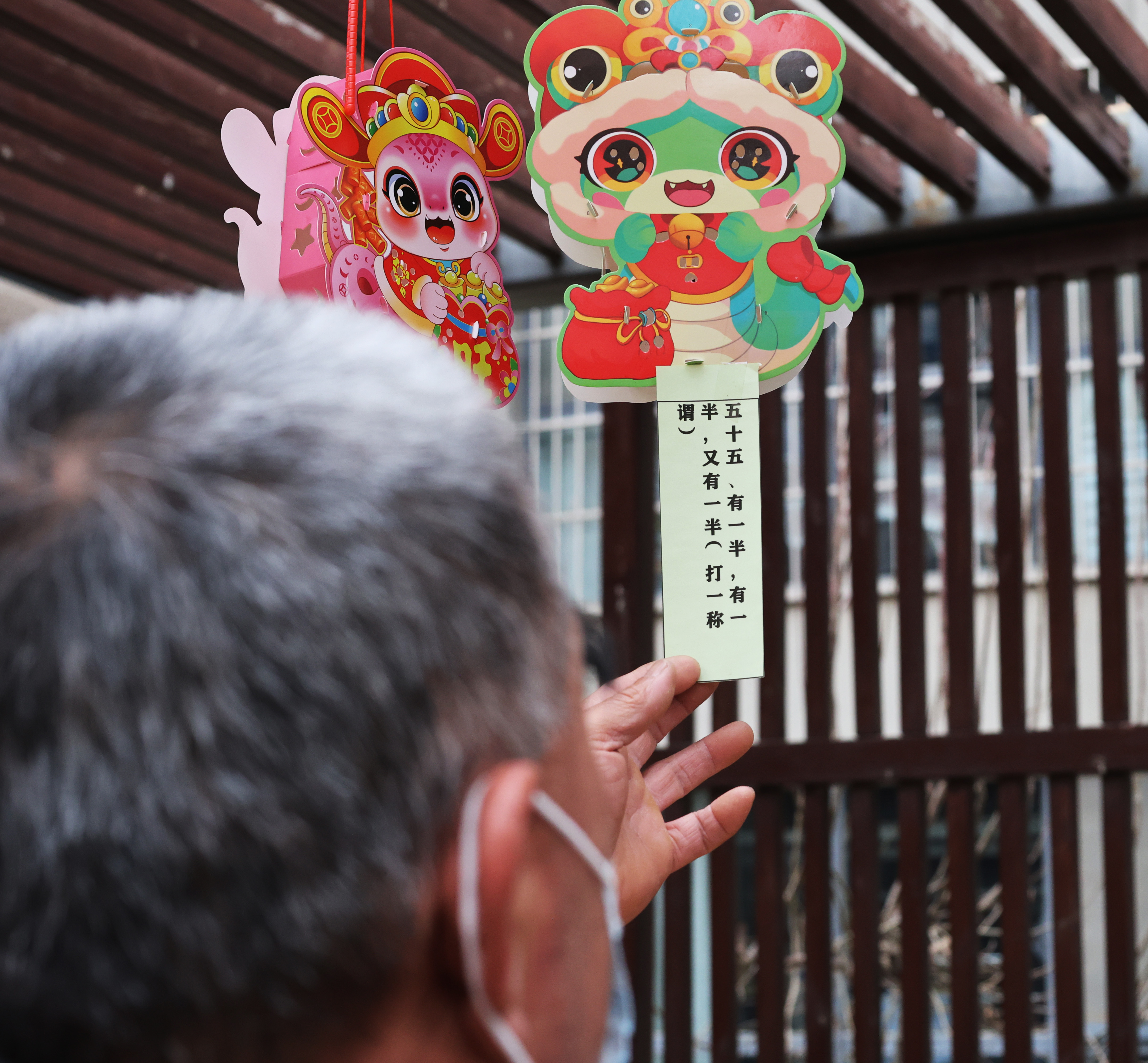 活動現場,五彩斑斕的燈籠高高掛起,隨風輕搖。“歡樂猜燈謎”環節備受居民喜愛,一條條寫滿謎題的彩綢在微風中飄動,引得大家駐足沉思。謎題內容豐富多樣,涵蓋文化、歷史、生活常識等多個領域,既充滿趣味,又富有挑戰性。一位扎著馬尾辮的小女孩,正盯著謎面,眉頭微皺,口中念念有詞:“二十四、正看八十八,倒看八十八;左看八十八,右看八十八……”不一會兒,她眼睛一亮,興奮地跑到工作人員面前說出答案,成功贏得掛著燈謎的小燈籠。周圍居民也紛紛為孩子的聰明鼓掌叫好,現場洋溢著濃厚的文化氛圍。