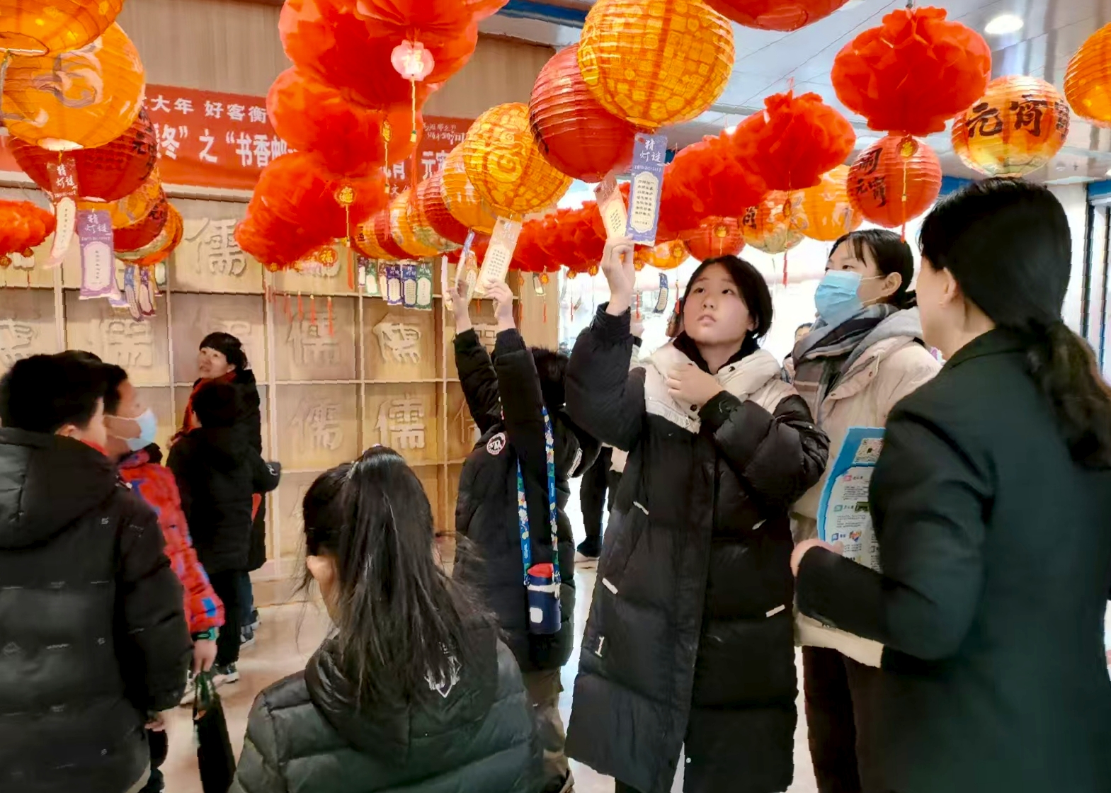 一旁的燈籠展示區,百余盞紅黃相間的燈籠高高掛起?!翱鞄臀遗膹堈?,這燈籠太好看啦!”一位年輕女孩興奮地拉著朋友,在燈籠墻前擺出各種姿勢。趁著猜燈謎排隊間隙,不少讀者都來此打卡留念,記錄下美好的節日瞬間。
