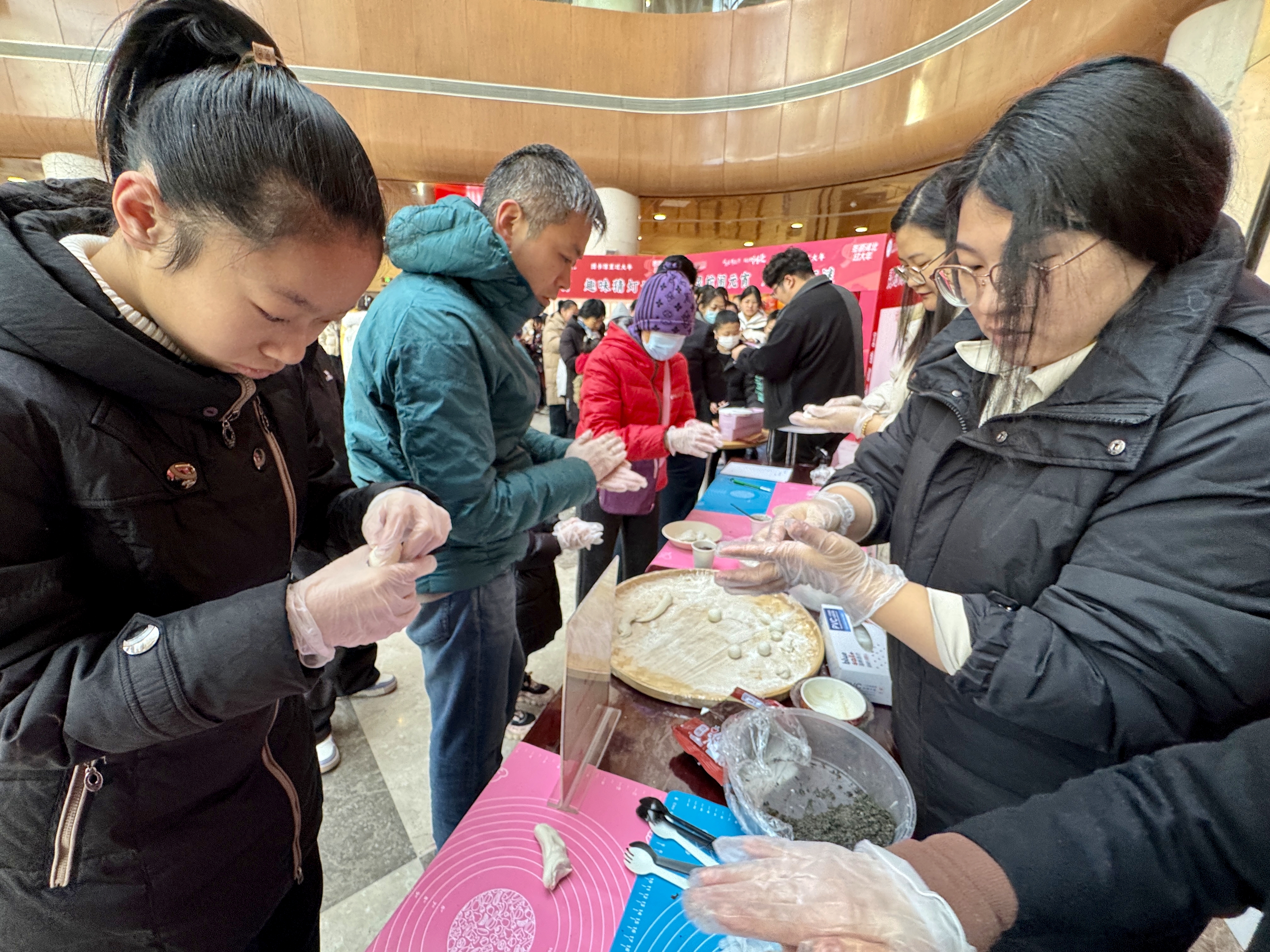 在巧手包湯圓手工體驗區,家長和孩子們圍坐在一起,桌上擺放著糯米粉、餡料和工具。一位媽媽熟練地搓面、放餡、收口,不一會兒,一個圓潤的湯圓就誕生了。孩子們也不甘示弱,盡管手法生疏,但學得十分專注,現場充滿歡聲笑語。