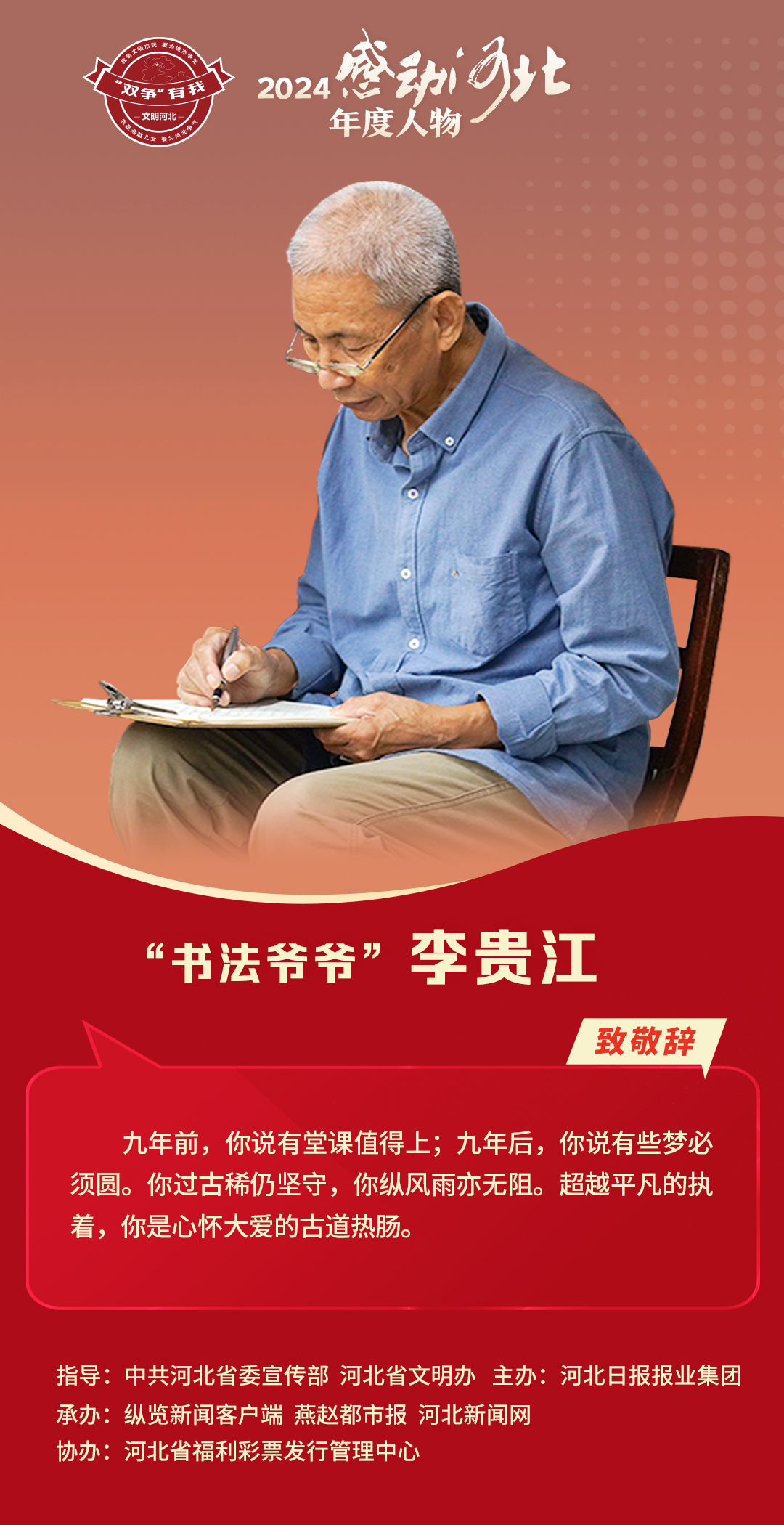 2012年,李貴江退休后,開始全身心投入書法學(xué)習(xí)中。他置辦了筆墨,買了 1000 多斤的廢舊紙張,做成書法練習(xí)冊,一撇一捺地學(xué)起毛筆書法。為了避免寫字時(shí)手抖,他還在手上拴上沙袋,每天堅(jiān)持寫一千個(gè)橫和豎。