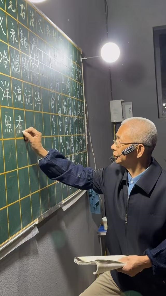 小黑板一掛就是9年。9年來,只要不是惡劣天氣,李貴江每天晚上都會準(zhǔn)時(shí)出現(xiàn)在廣場。寒暑假期間,隨著學(xué)生的增多,李貴江還會在上午加開一節(jié)書法課。