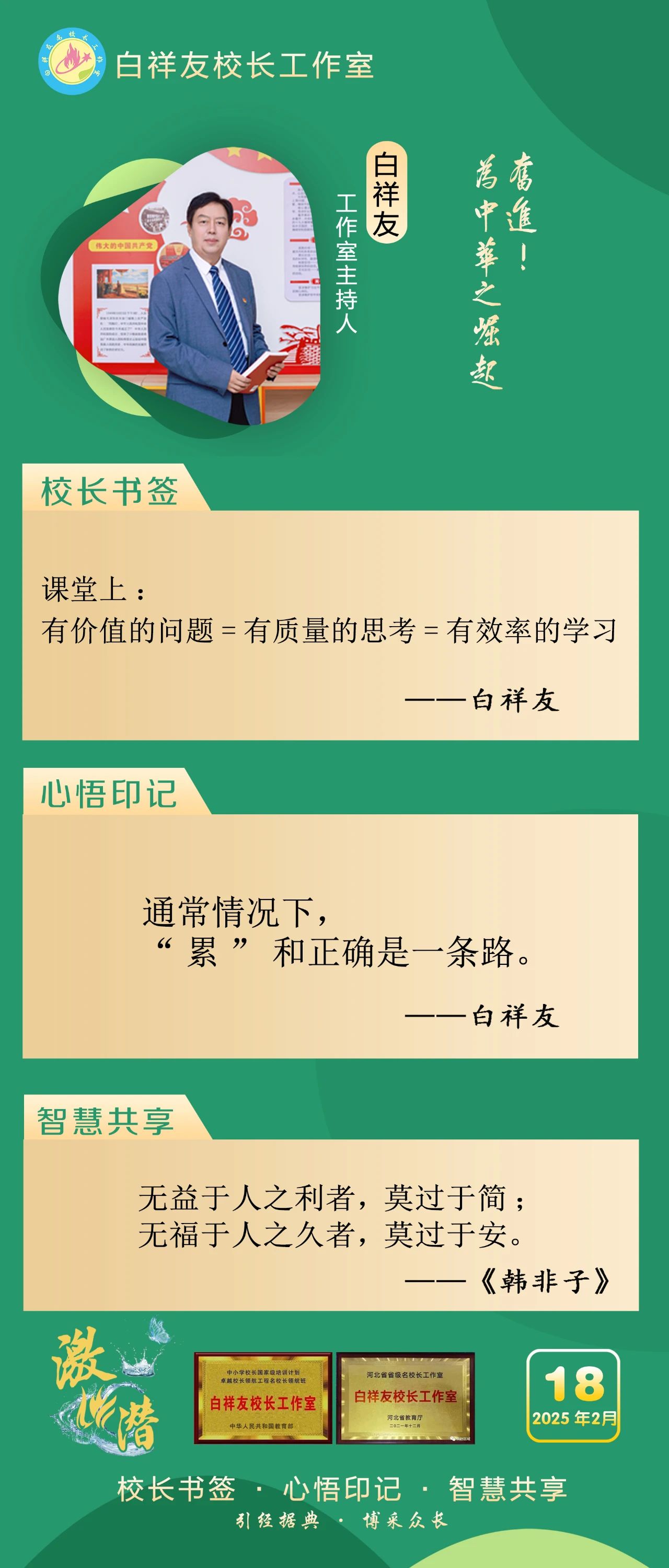 “白祥友校長工作室”成立于2019年4月,是教育部“國培計劃”中小學名校長領航工程、河北省首批名校長工作室,目前省內外成員校56個。工作室堅持“資源共享、智慧共融、互助共贏”理念,已成為思想碰撞的交流場,資源共享的品牌站,成果展示的輻射源。
