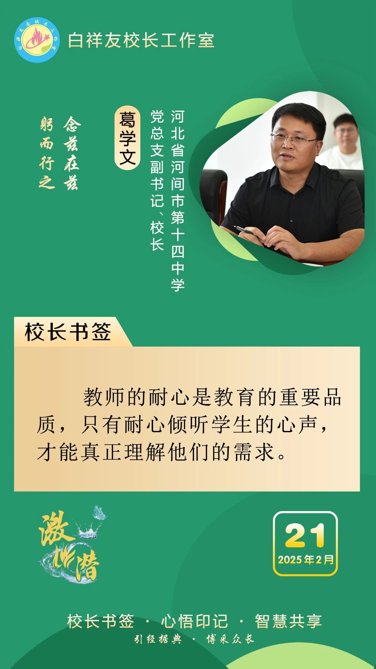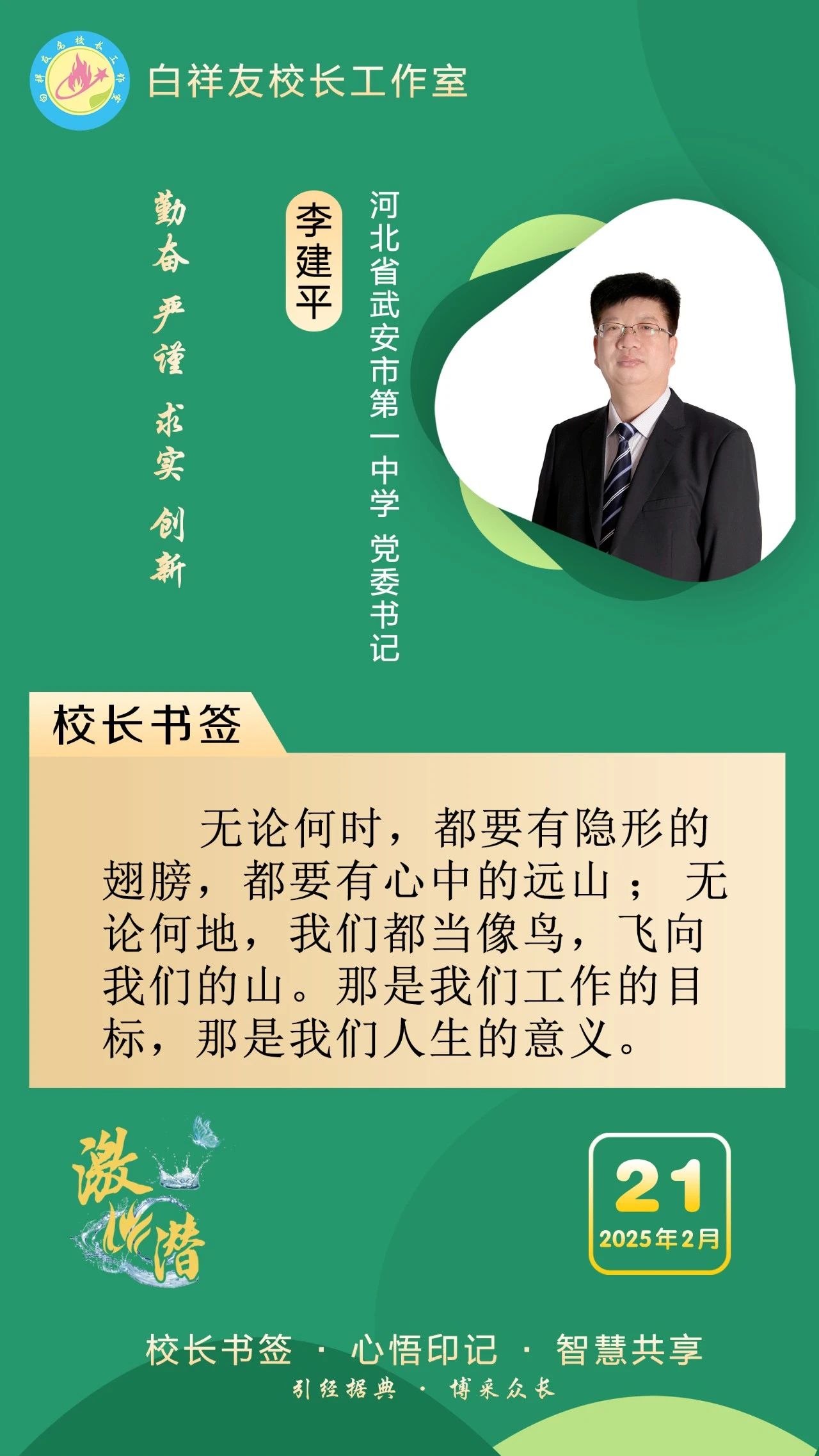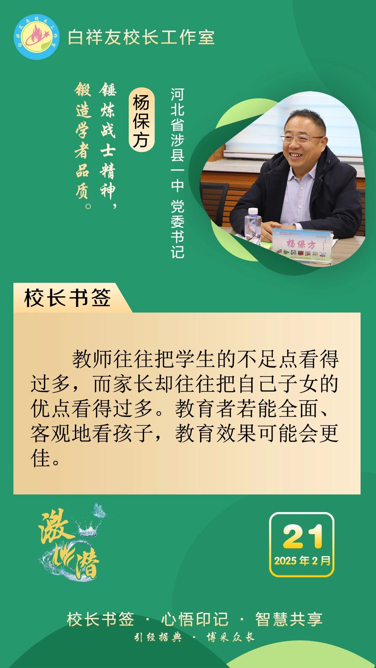 “白祥友校長(zhǎng)工作室”成立于2019年4月,是教育部“國(guó)培計(jì)劃”中小學(xué)名校長(zhǎng)領(lǐng)航工程、河北省首批名校長(zhǎng)工作室,目前省內(nèi)外成員校56個(gè)。工作室堅(jiān)持“資源共享、智慧共融、互助共贏”理念,已成為思想碰撞的交流場(chǎng),資源共享的品牌站,成果展示的輻射源。