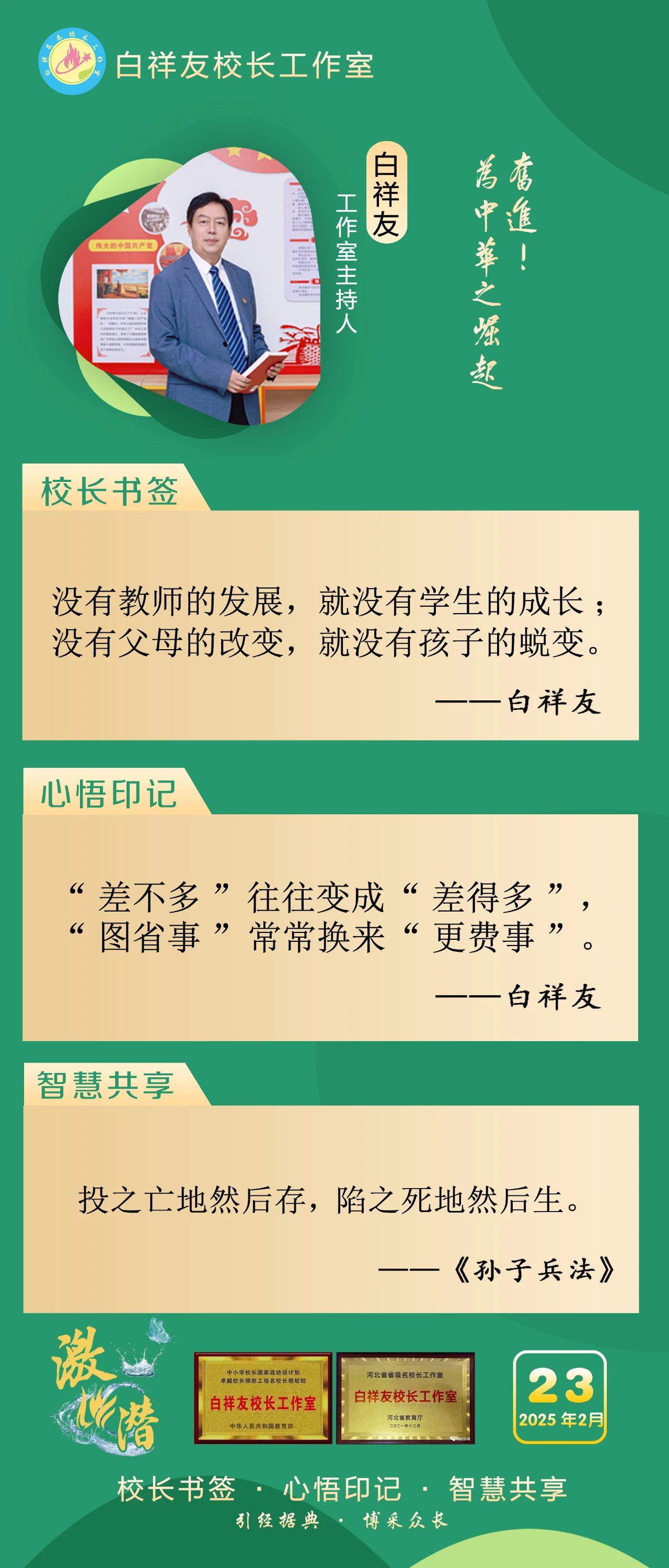 “白祥友校長工作室”成立于2019年4月,是教育部“國培計劃”中小學名校長領航工程、河北省首批名校長工作室,目前省內外成員校56個。工作室堅持“資源共享、智慧共融、互助共贏”理念,已成為思想碰撞的交流場,資源共享的品牌站,成果展示的輻射源。