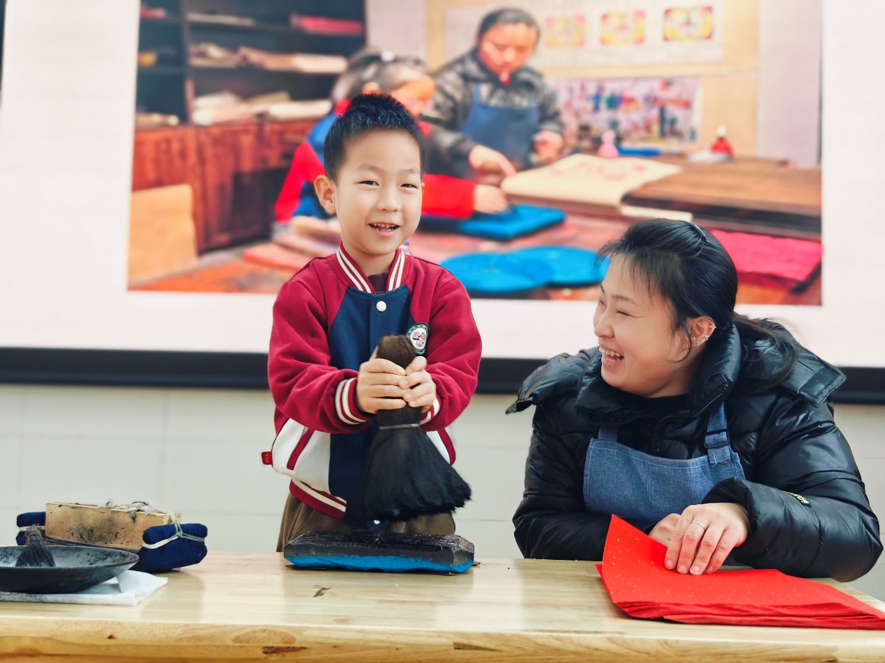 在“小手印出‘年’味道”環節,孩子們化身小小非遺傳承人。他們洗凈小手,在年畫技師的指導下,手持特制的工具蘸上顏料,用紅紅的宣紙在木版上印出一幅幅充滿童趣的門神年畫。孩子們興奮地舉著親手制作的年畫作品歡呼雀躍起來。