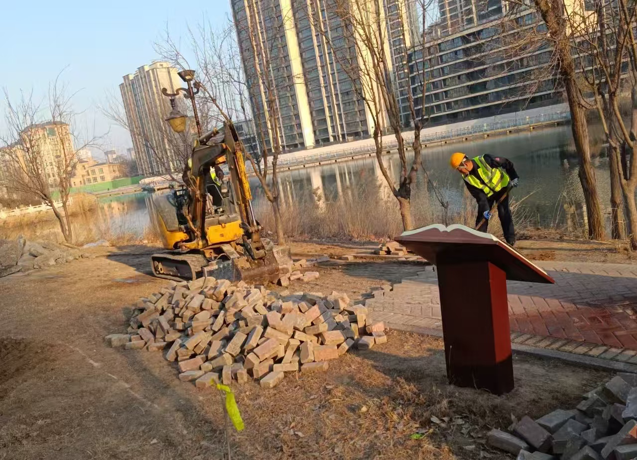 三月的市區(qū)怡水園,春光無限。在市區(qū)怡水園公園海綿改造工程施工現(xiàn)場(chǎng),一片繁忙景象:小型挖掘機(jī)轟鳴作業(yè),破土、挖槽、平整地面,一旁的施工工人正在忙著鋪設(shè)透水磚塊,清理路面雜石……
