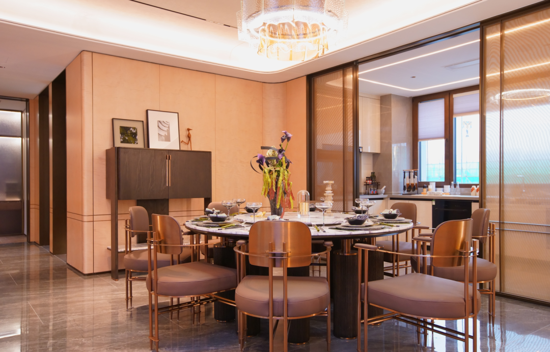蘭園以宋衛平團隊十余年豪宅營造精髓為基底,溯源杭州武林壹號寶石流霞設計靈感,將衡水釋迦文舍利寶塔與流線型玻璃幕墻結合,打造出光影流轉的香檳色外立面。太陽能光伏板巧妙嵌入中式披檐,既實現能源革新,又避免視覺破壞。九重奢境體系中,地下星空穹頂、四季花廳自然光幕等細節,均以百道工序雕琢。