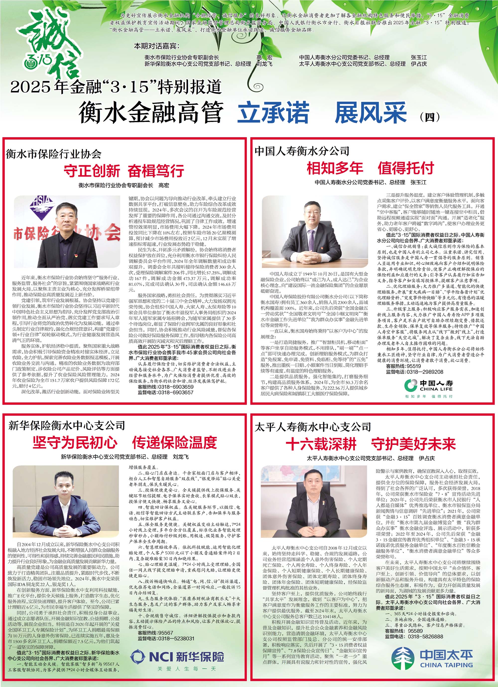 為更好宣傳展示衡水金融機構“合規經營、誠信服務”的良好形象、讓衡水金融消費者更加了解各金融機構特色服務和便民舉措,“3·15”金融消費者權益保護教育宣傳活動期間,國家金融監督管理總局衡水監管分局、中國人民銀行衡水市分行、衡水日報社聯合推出2025年金融“3·15”特別報道:“衡水金融高管—立承諾、展風采”,打造衡水金融單位承諾踐諾、誠信服務金融品牌。