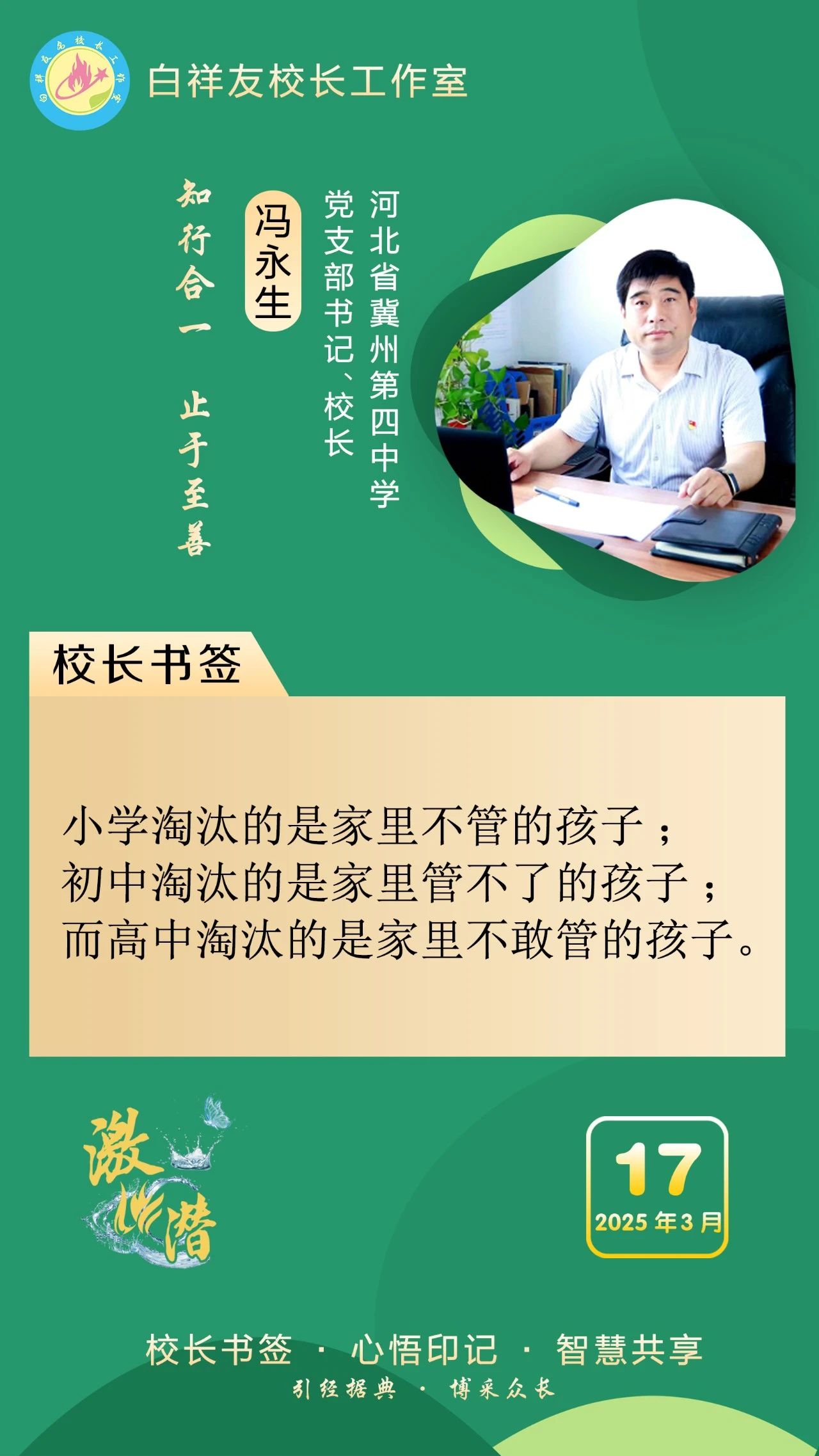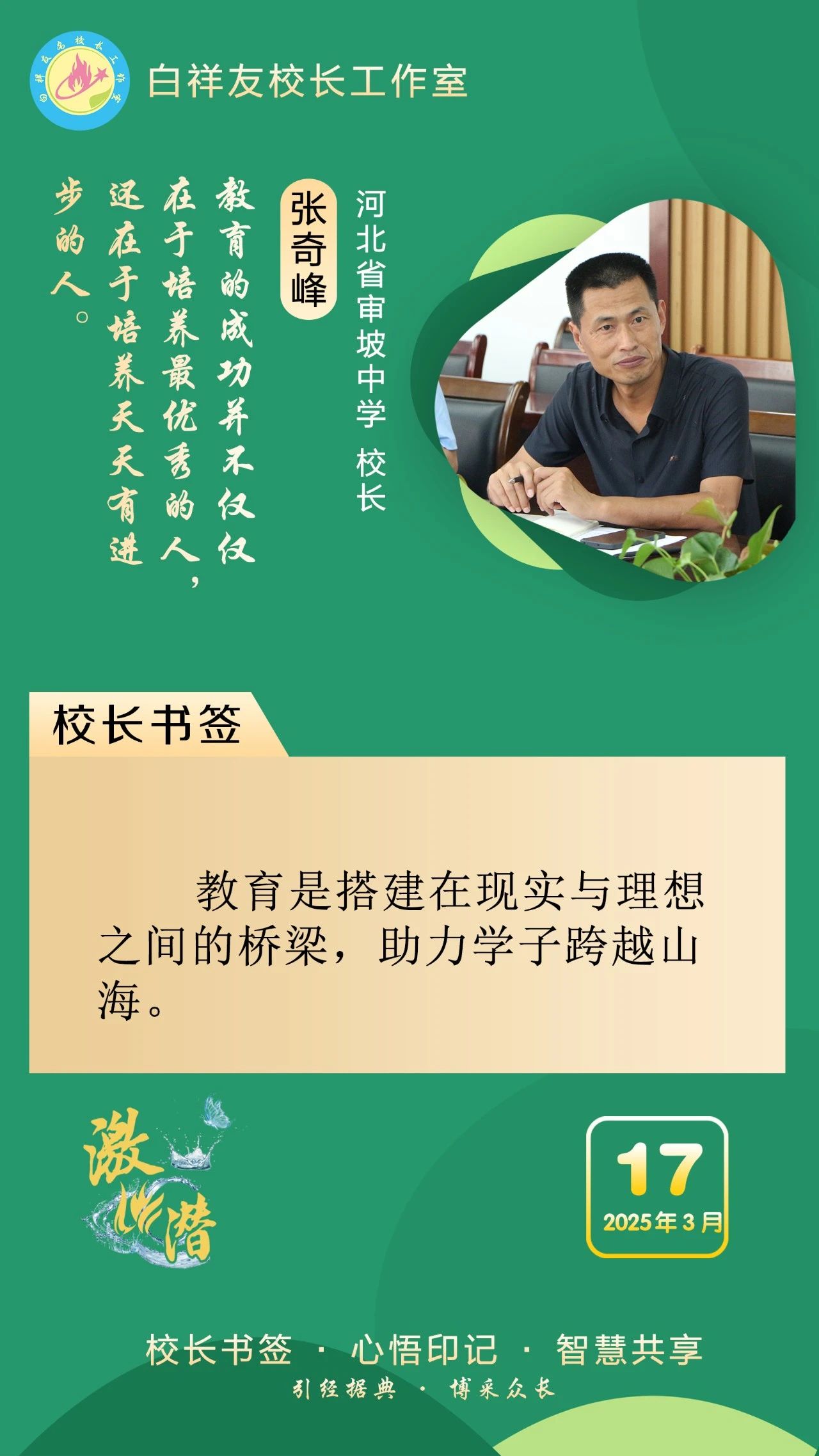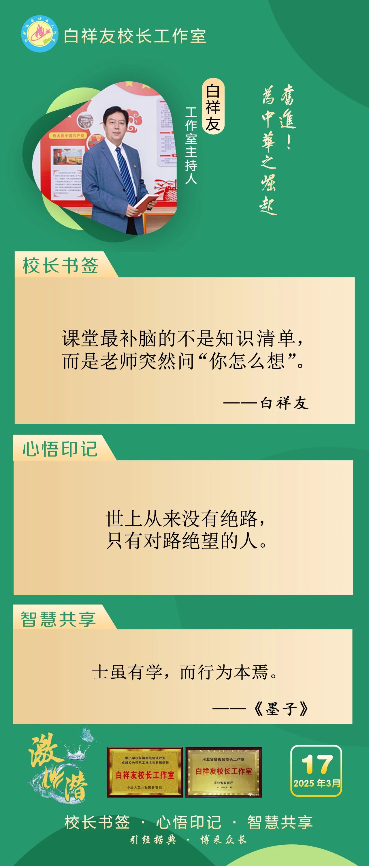 “白祥友校長工作室”成立于2019年4月,是教育部“國培計劃”中小學名校長領航工程、河北省首批名校長工作室,目前省內外成員校56個。工作室堅持“資源共享、智慧共融、互助共贏”理念,已成為思想碰撞的交流場,資源共享的品牌站,成果展示的輻射源。