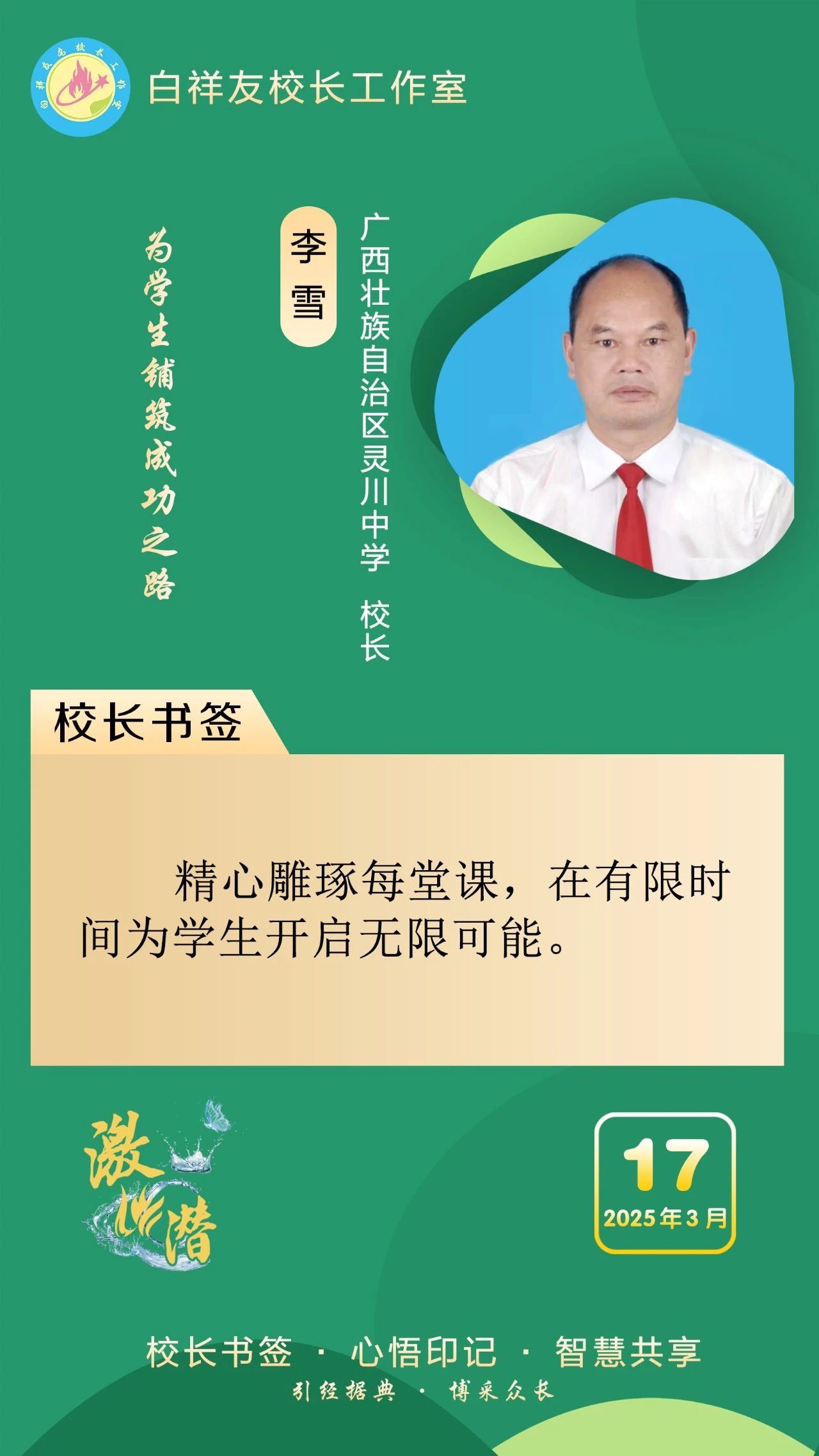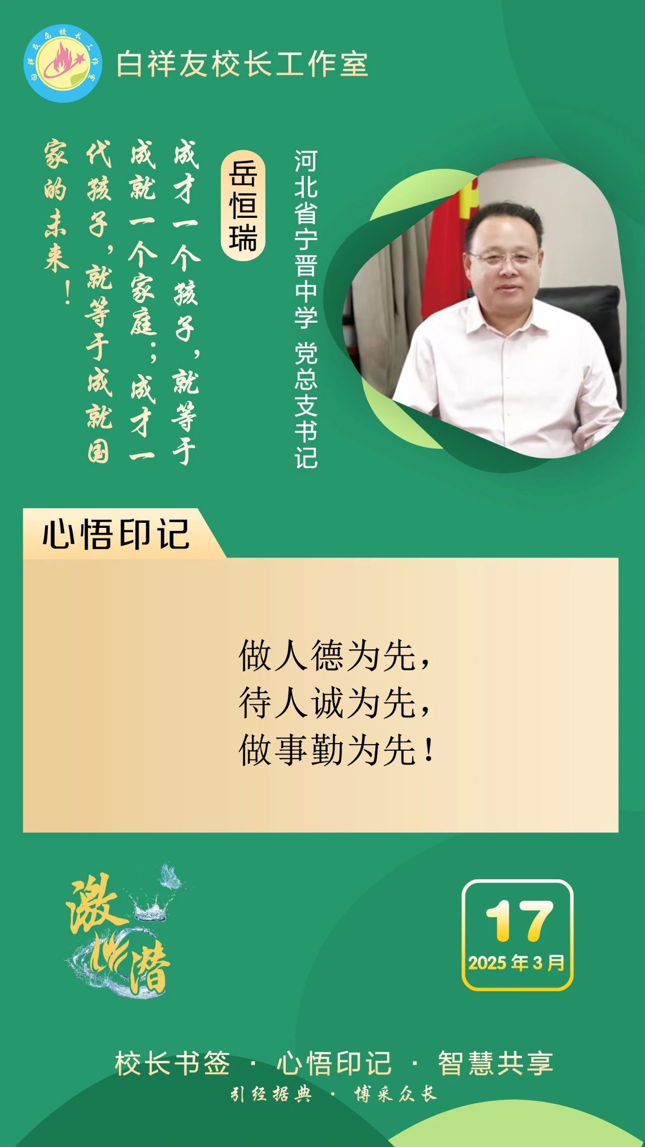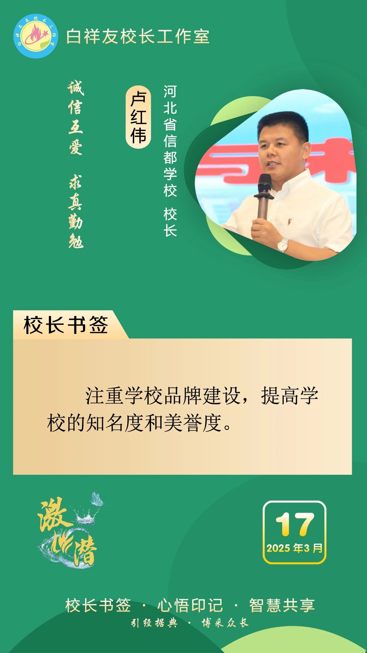 “白祥友校長工作室”成立于2019年4月,是教育部“國培計劃”中小學名校長領航工程、河北省首批名校長工作室,目前省內外成員校56個。工作室堅持“資源共享、智慧共融、互助共贏”理念,已成為思想碰撞的交流場,資源共享的品牌站,成果展示的輻射源。