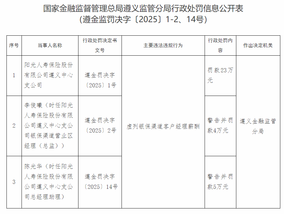 根據國家金融監督管理總局網站近日發布的行政處罰信息公開表(遵金罰決字〔2025〕1號、2號、14號)顯示,因虛列銀保渠道客戶經理薪酬,國家金融監督管理總局遵義金融監管分局對陽光人壽保險股份有限公司遵義中心支公司罰款23萬元。