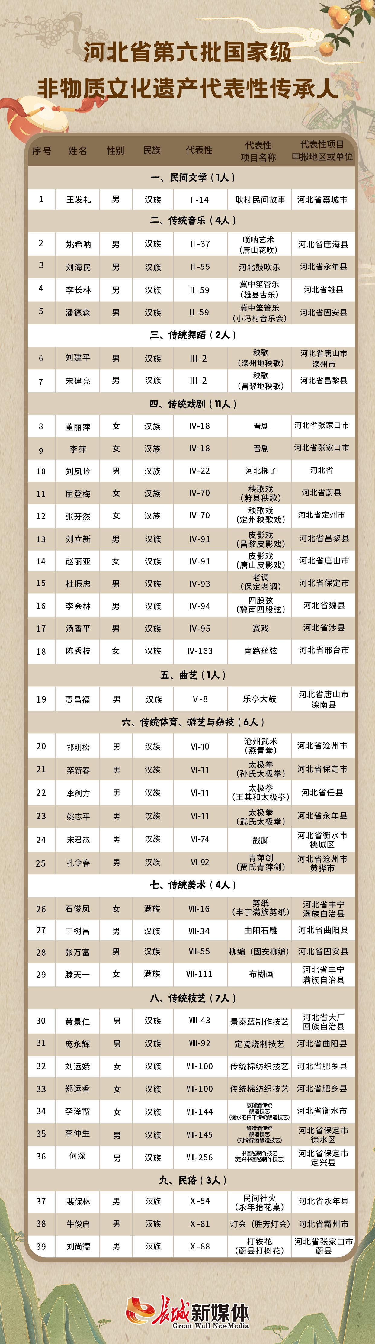 3月17日,文化和旅游部印發《關于公布第六批國家級非物質文化遺產代表性傳承人的通知》(文旅非遺發〔2025〕23號),公布第六批國家級非物質文化遺產代表性傳承人名單(942人)。河北王發禮、姚希吶、劉海明等39人入選。