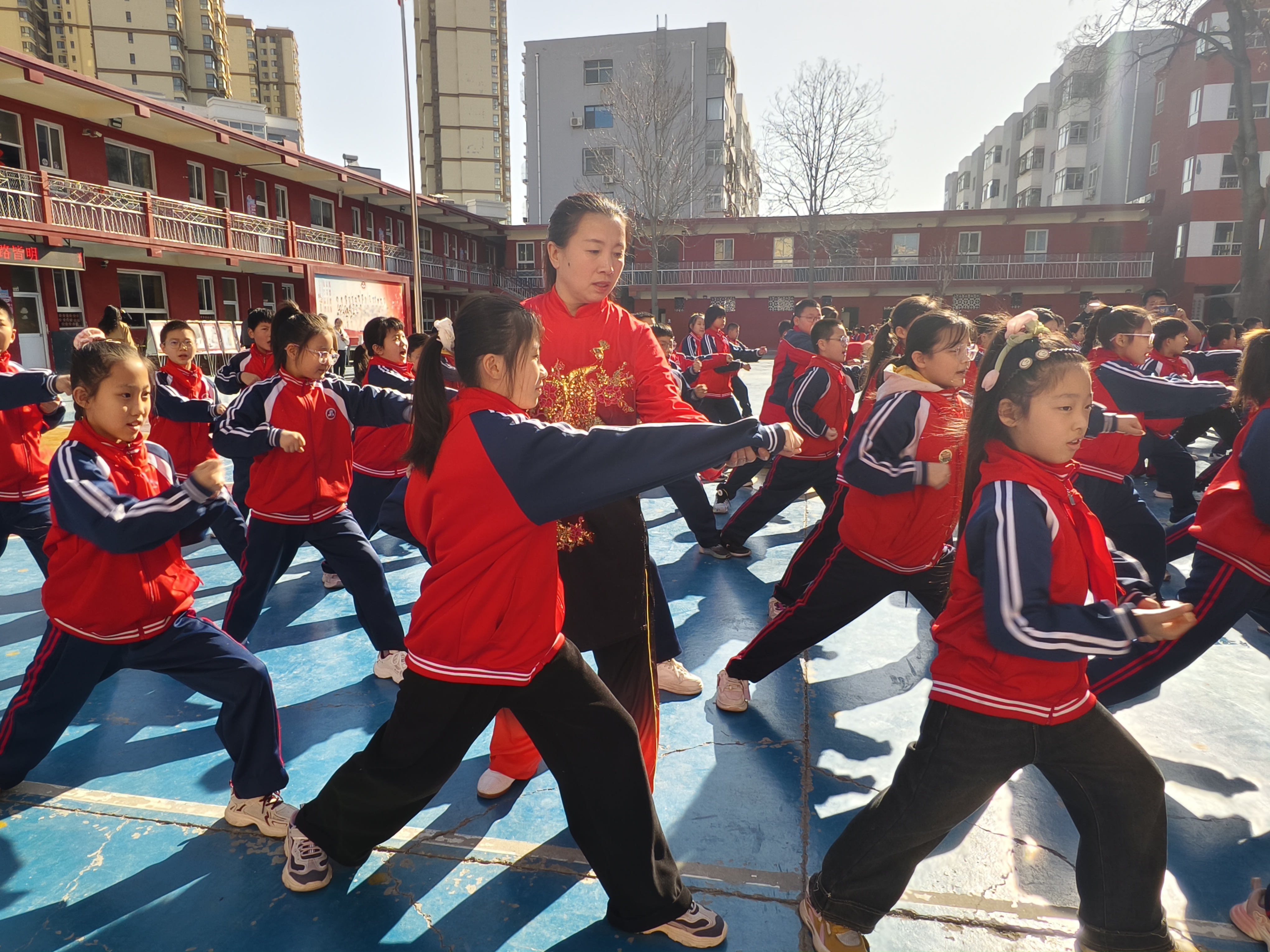表演結束后,進入了互動教學環節。同學們紛紛踴躍上臺,在武術教練們的耐心指導下,學習戳腳的基本動作和要領。盡管有些動作對于初次接觸的同學們來說頗具難度,但大家都學得格外認真,一招一式有模有樣。