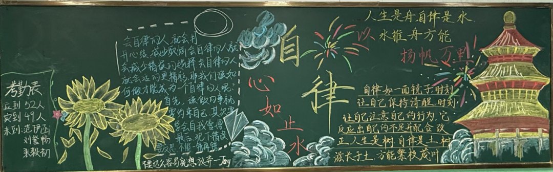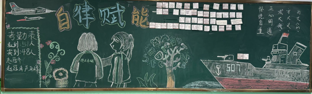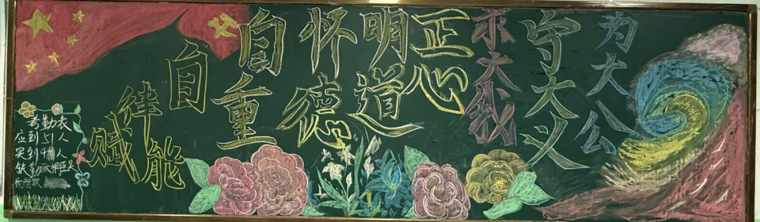 板報不僅是班級文化的展示,更是思想教育的重要陣地。同學們通過視覺化的創作過程,引導自我深入思考自律的內涵,將“為大公”的責任意識與“守大義”的道德追求內化為成長動力,以“正心明道,懷德自重”為切入點,以創意為筆,以思想為墨,在方寸黑板間勾勒出青年學子對自律精神的深刻詮釋。