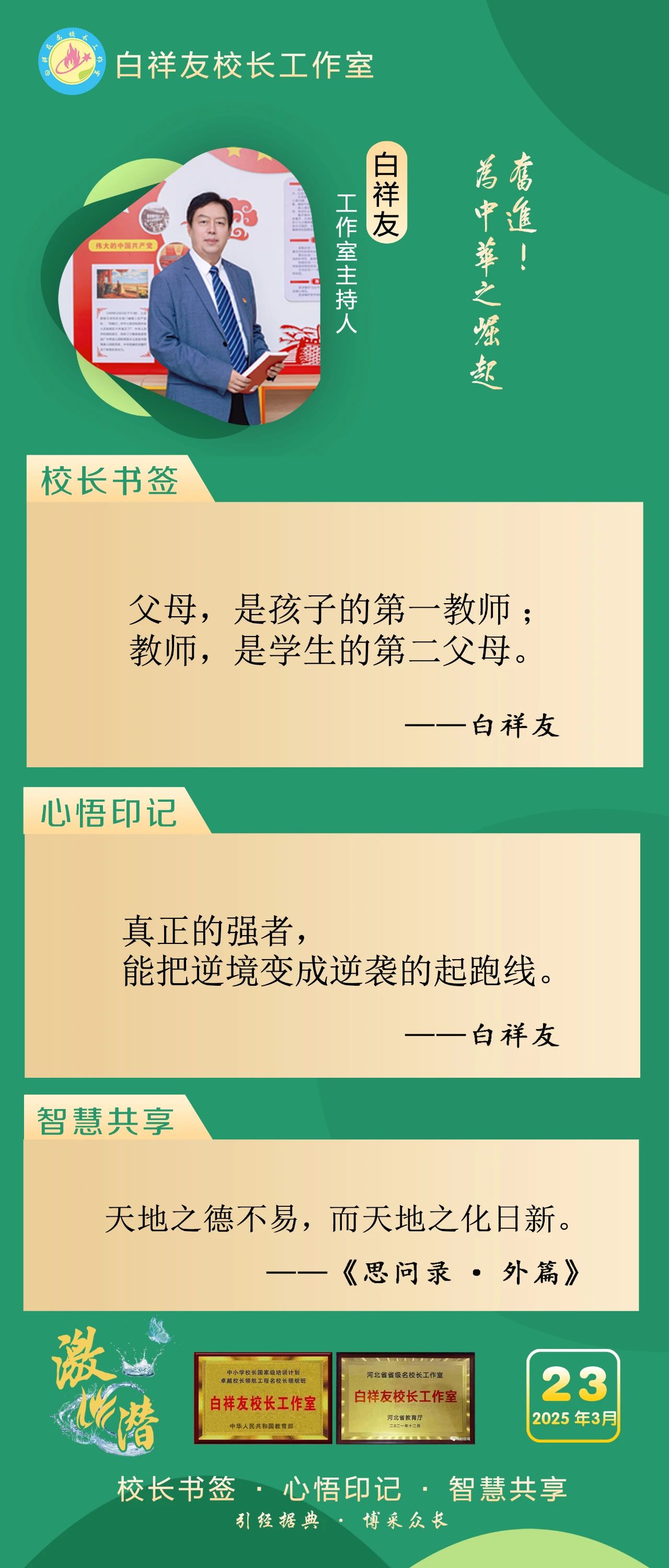 “白祥友校長工作室”成立于2019年4月,是教育部“國培計劃”中小學(xué)名校長領(lǐng)航工程、河北省首批名校長工作室,目前省內(nèi)外成員校56個。工作室堅持“資源共享、智慧共融、互助共贏”理念,已成為思想碰撞的交流場,資源共享的品牌站,成果展示的輻射源。