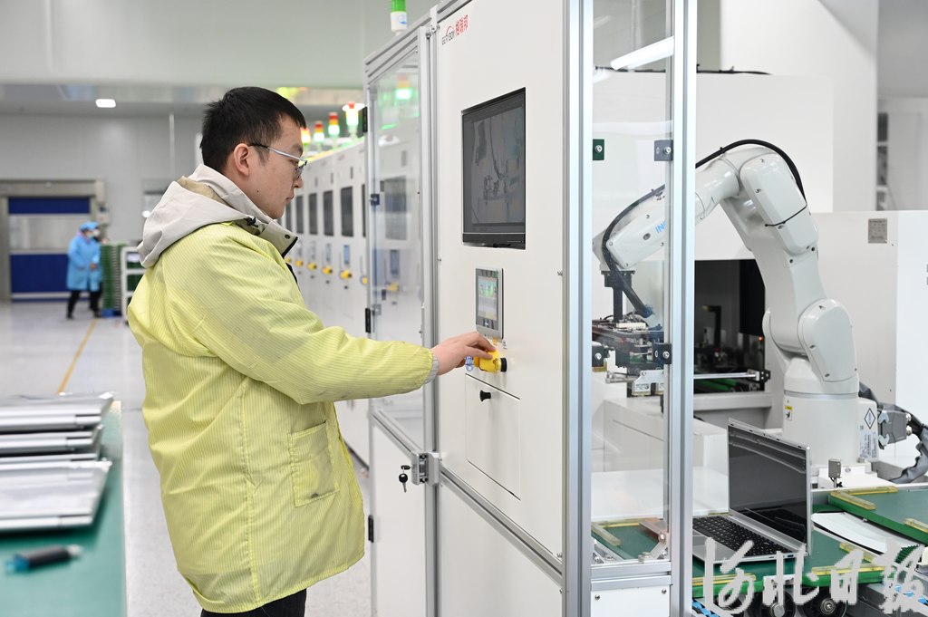 2月19日,格瑞邦(河北)數字科技有限公司生產車間,工作人員操作自動化機械臂,將組裝完成的產品移至自動化檢測線。河北日報記者張曉超攝