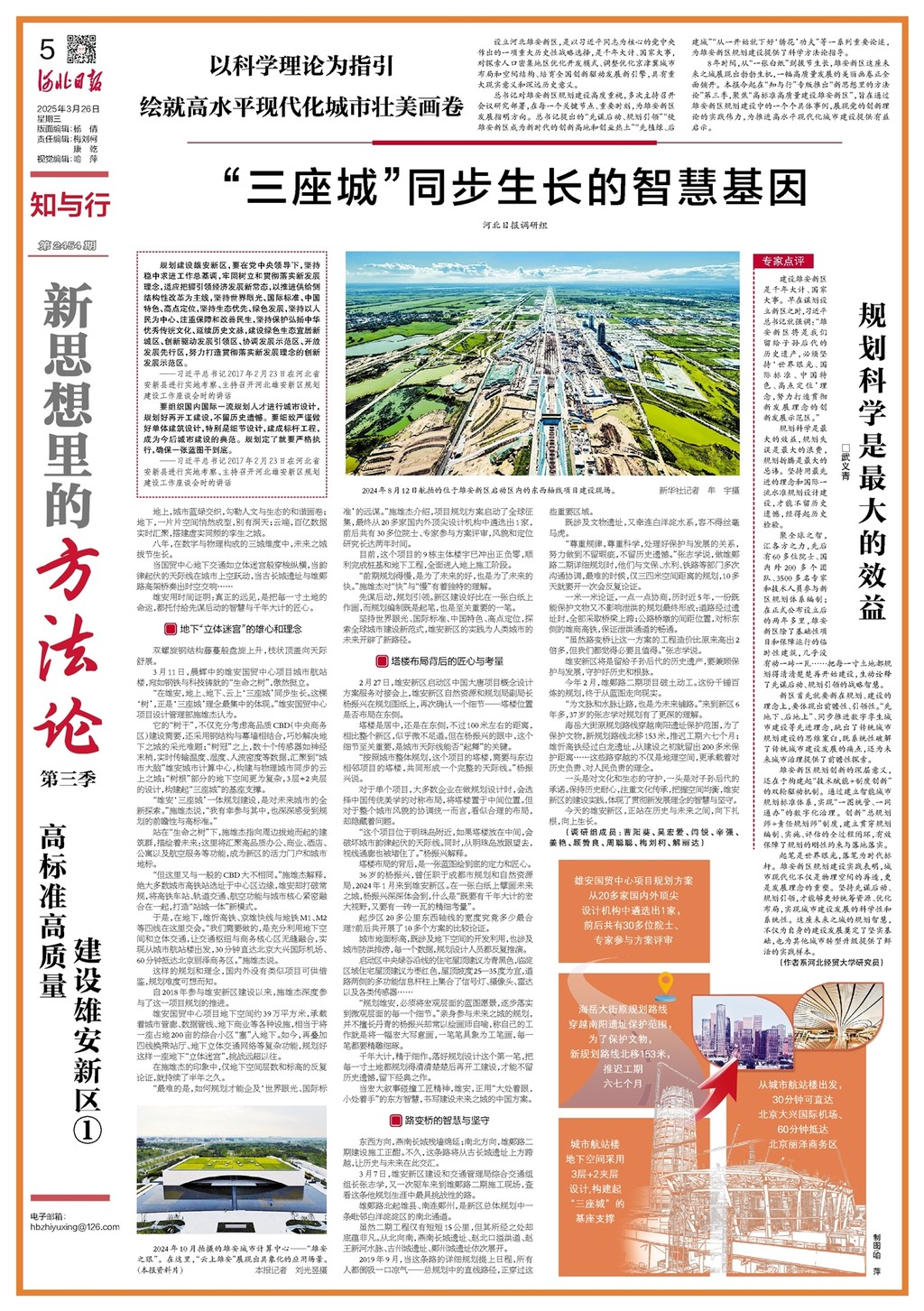 8年時間,從“一張白紙”到拔節生長,雄安新區這座未來之城展現出勃勃生機,一幅高質量發展的美麗畫卷正全面鋪開。本報今起在“知與行”專版推出“新思想里的方法論”第三季,聚焦“高標準高質量建設雄安新區”,旨在通過雄安新區規劃建設中的一個個具體事例,展現黨的創新理論的實踐偉力,為推進高水平現代化城市建設提供有益啟示。