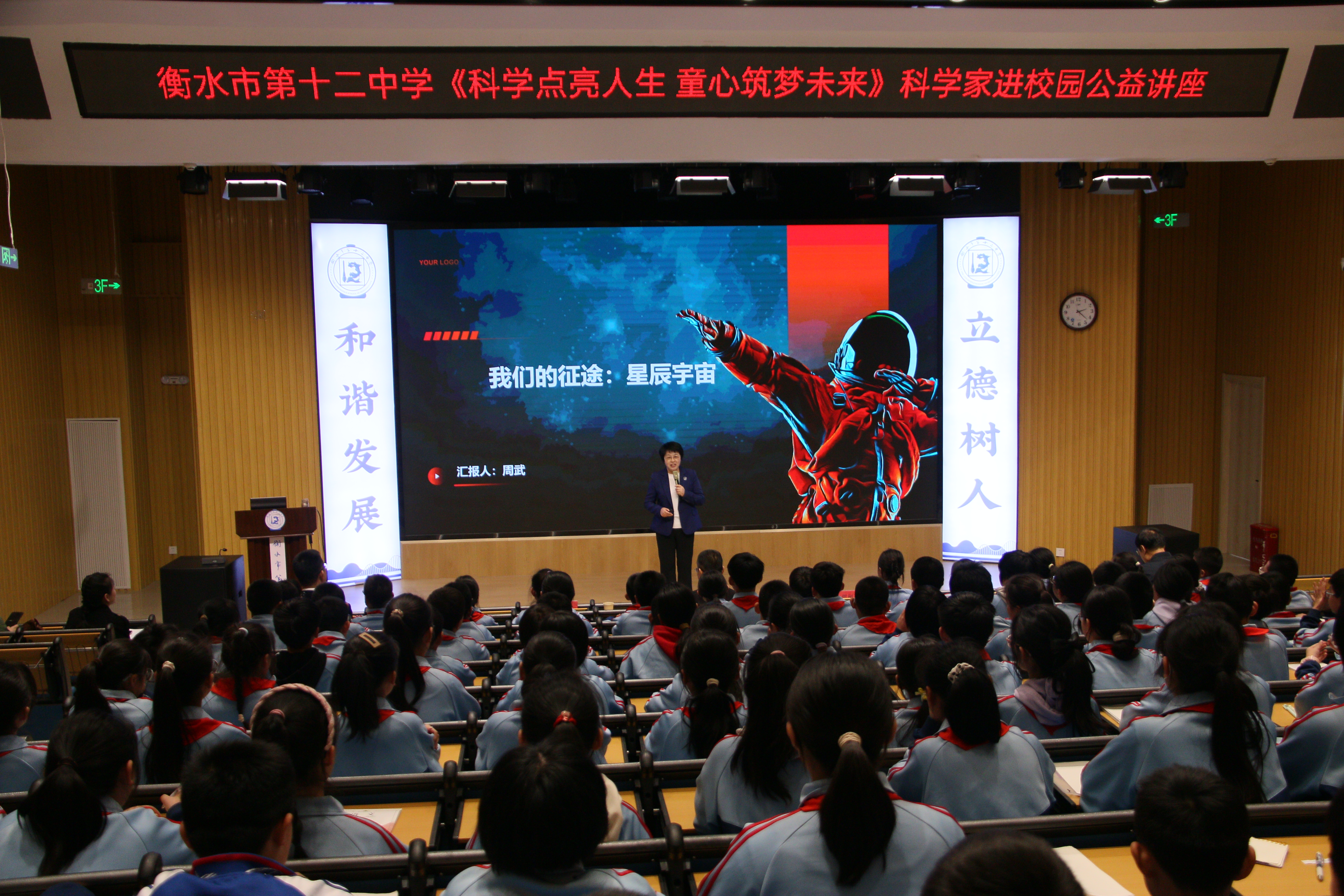 航天科普專家周武以其深厚的學術底蘊和卓越的科普貢獻,贏得了在場師生的熱烈歡迎與高度贊譽。衡水市第十二中學聘請周武老師為學校科學副校長,以期在科學的道路上攜手共進,開創更加輝煌的未來。