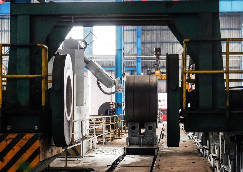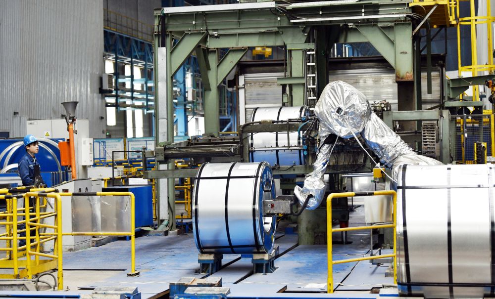 ??3月14日,鑫達鋼鐵公司自動化卷板生產線上,智能機械臂在給鋼卷噴涂編碼。新華社記者楊帆 攝