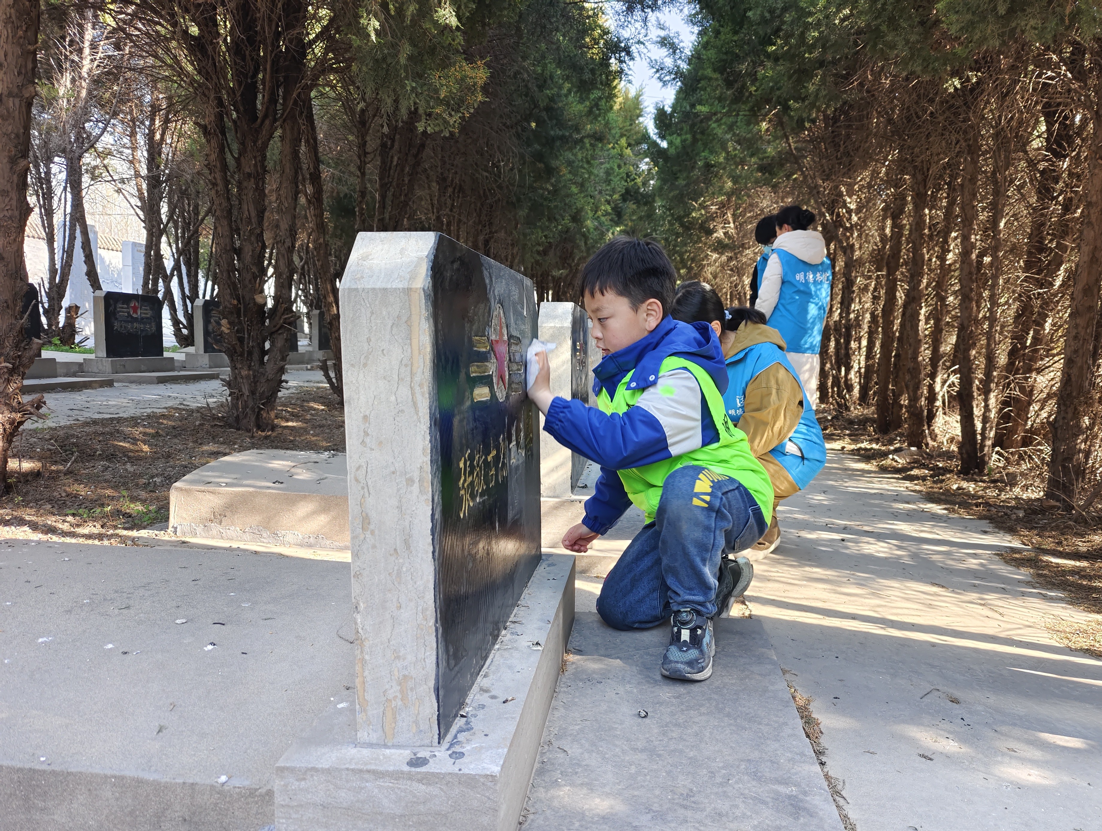 祭掃中,黨員代表、退役軍人代表在每位烈士墓前,深鞠三躬后再認(rèn)真細(xì)致地擦拭墓碑、清掃祭臺(tái),以表對(duì)烈士的敬仰之情。“叔叔,你們守護(hù)了我們的家園,現(xiàn)在換我們守護(hù)你們。”小朋友們也紛紛拿出手帕,學(xué)著大人的樣子,輕輕擦拭著。還有小朋友將隨身攜帶的糖果敬獻(xiàn)給烈士,“希望烈士叔叔能嘗到糖果的甜,知道我們現(xiàn)在的生活有多幸福。”