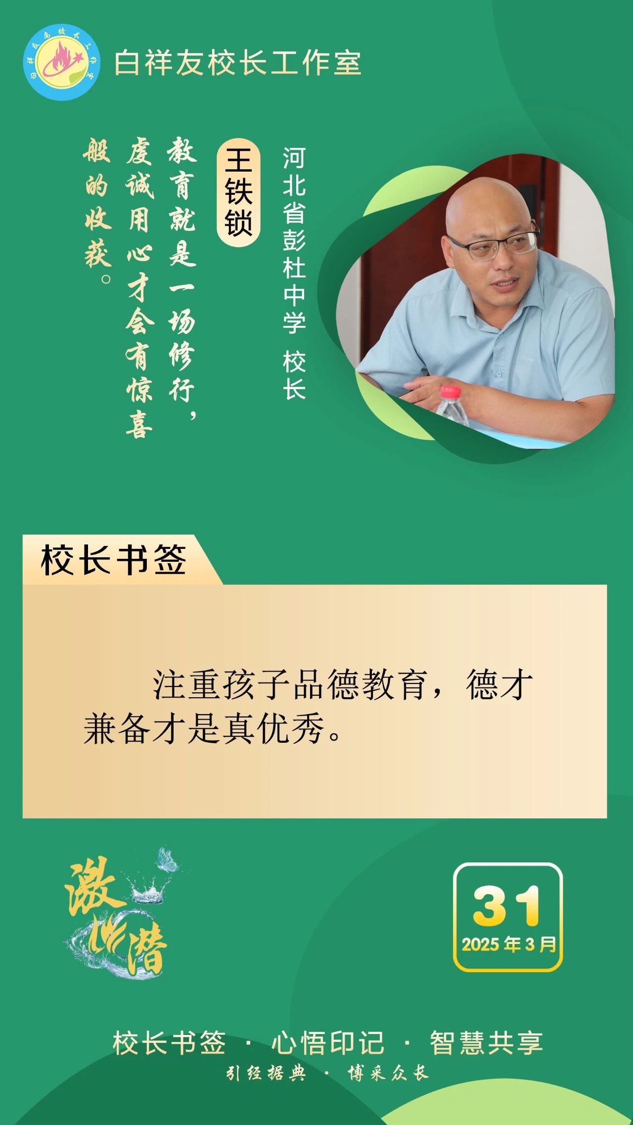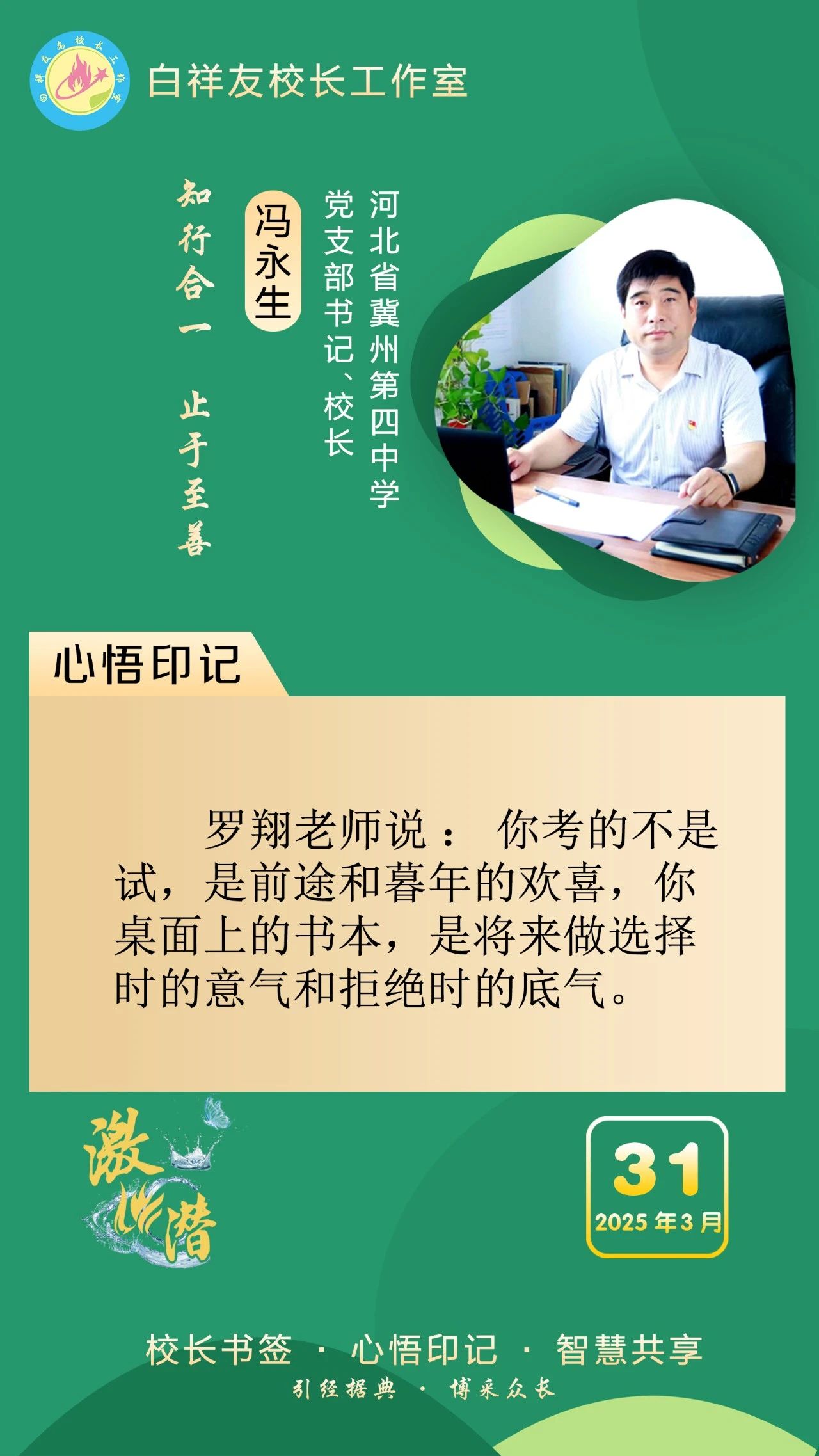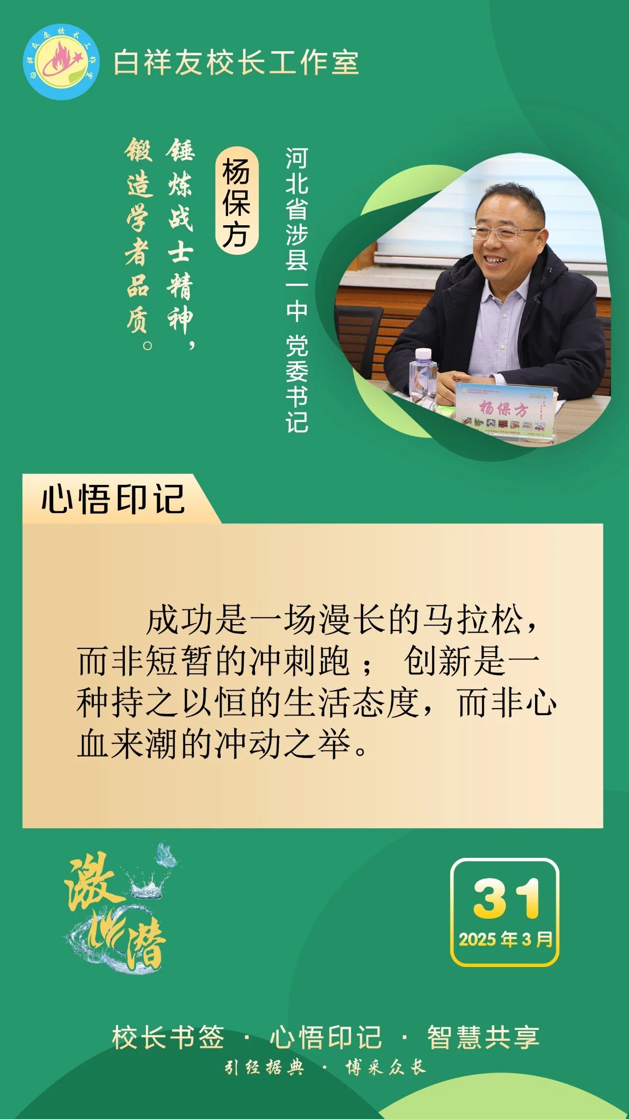 “白祥友校長工作室”成立于2019年4月,是教育部“國培計劃”中小學名校長領航工程、河北省首批名校長工作室,目前省內外成員校56個。工作室堅持“資源共享、智慧共融、互助共贏”理念,已成為思想碰撞的交流場,資源共享的品牌站,成果展示的輻射源。