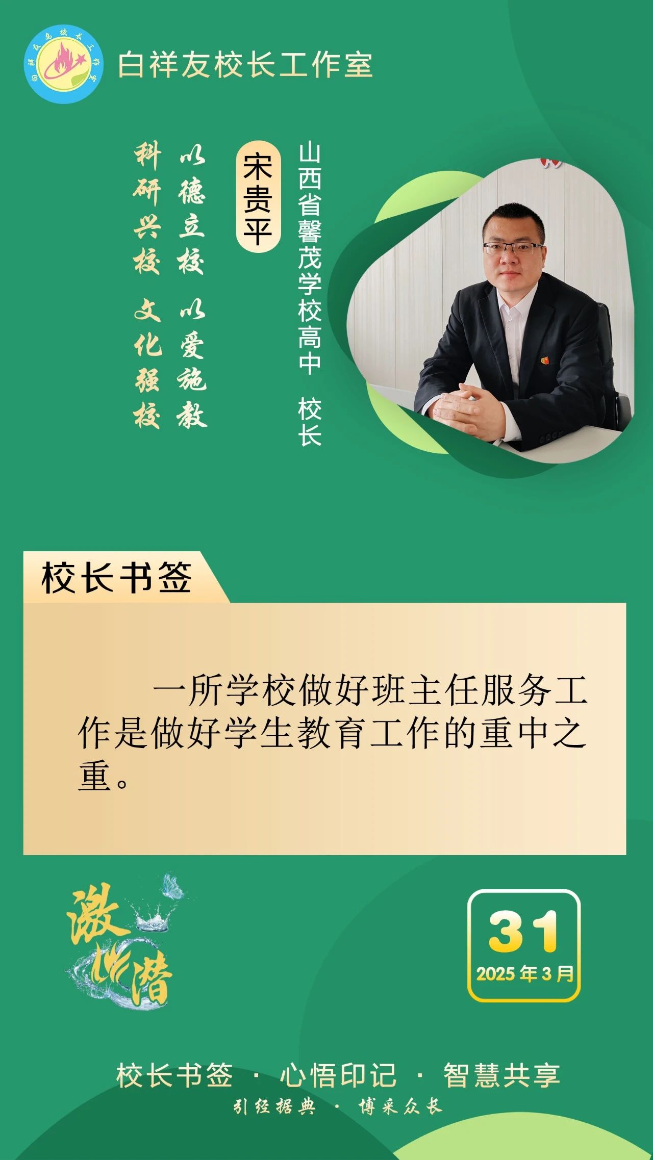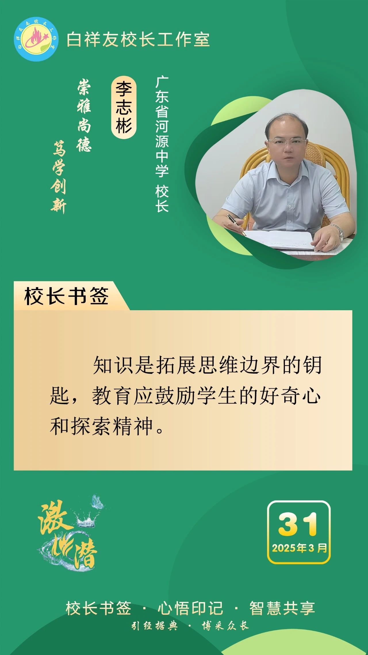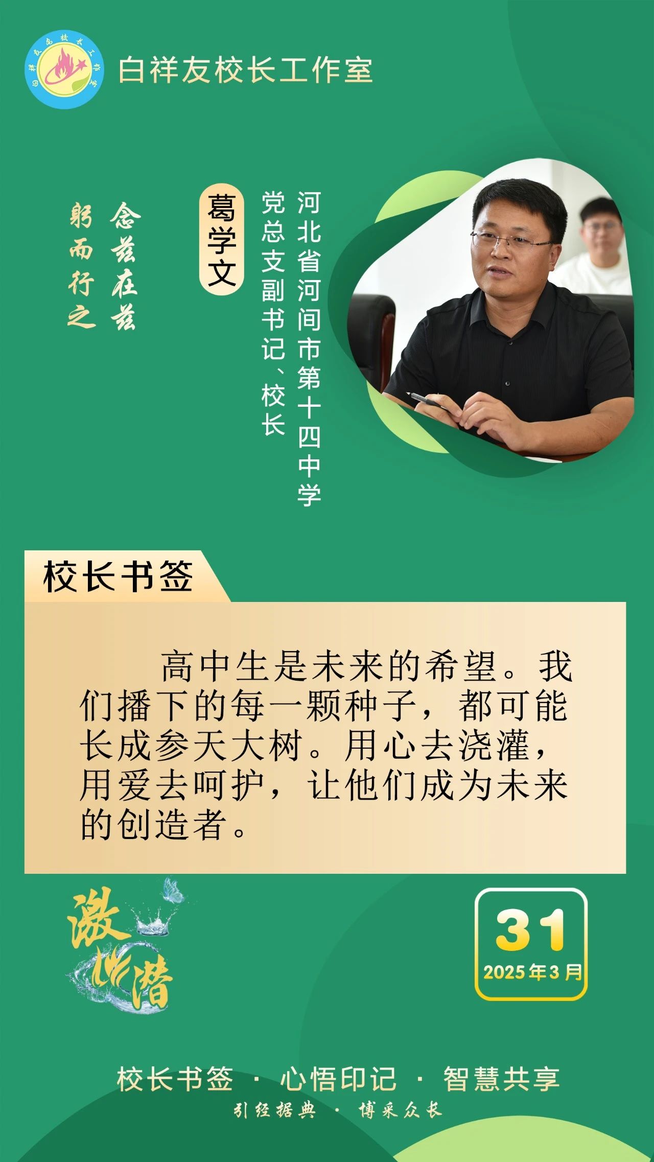 “白祥友校長工作室”成立于2019年4月,是教育部“國培計劃”中小學名校長領航工程、河北省首批名校長工作室,目前省內外成員校56個。工作室堅持“資源共享、智慧共融、互助共贏”理念,已成為思想碰撞的交流場,資源共享的品牌站,成果展示的輻射源。