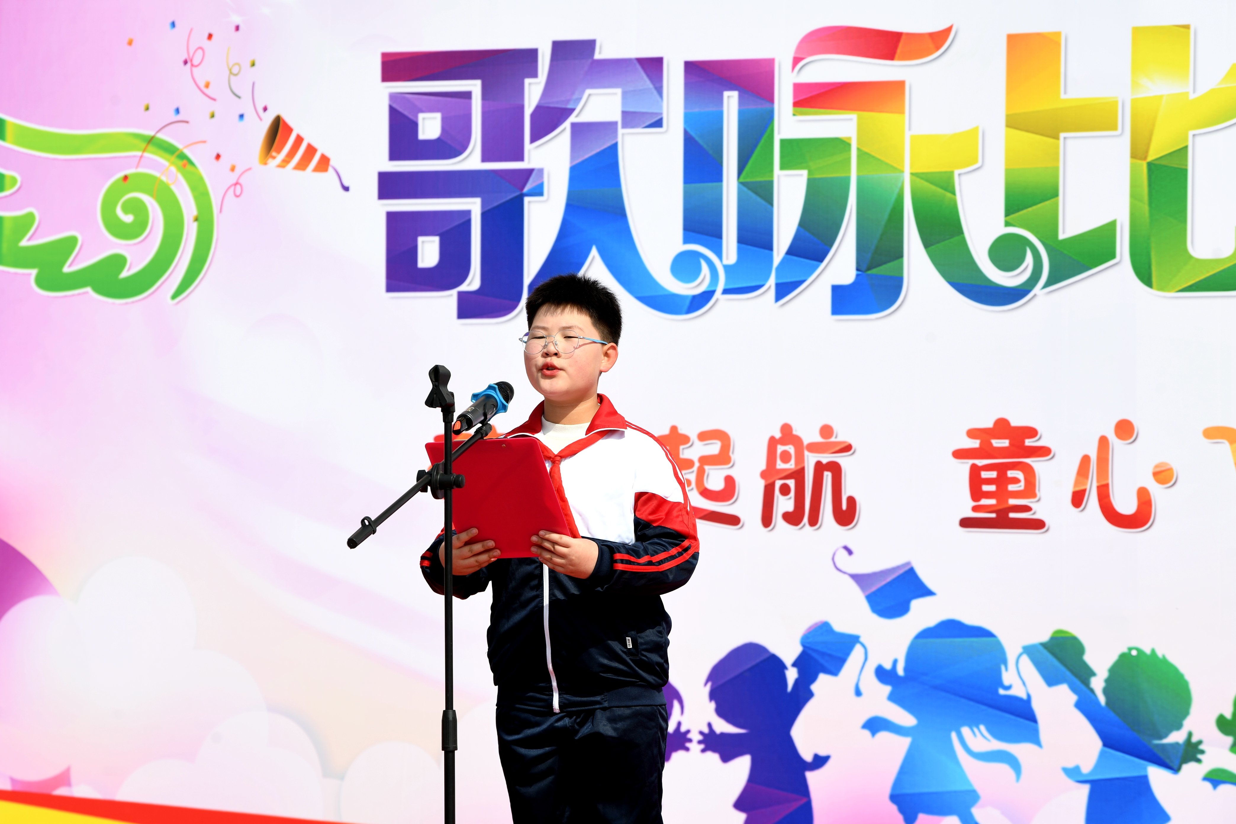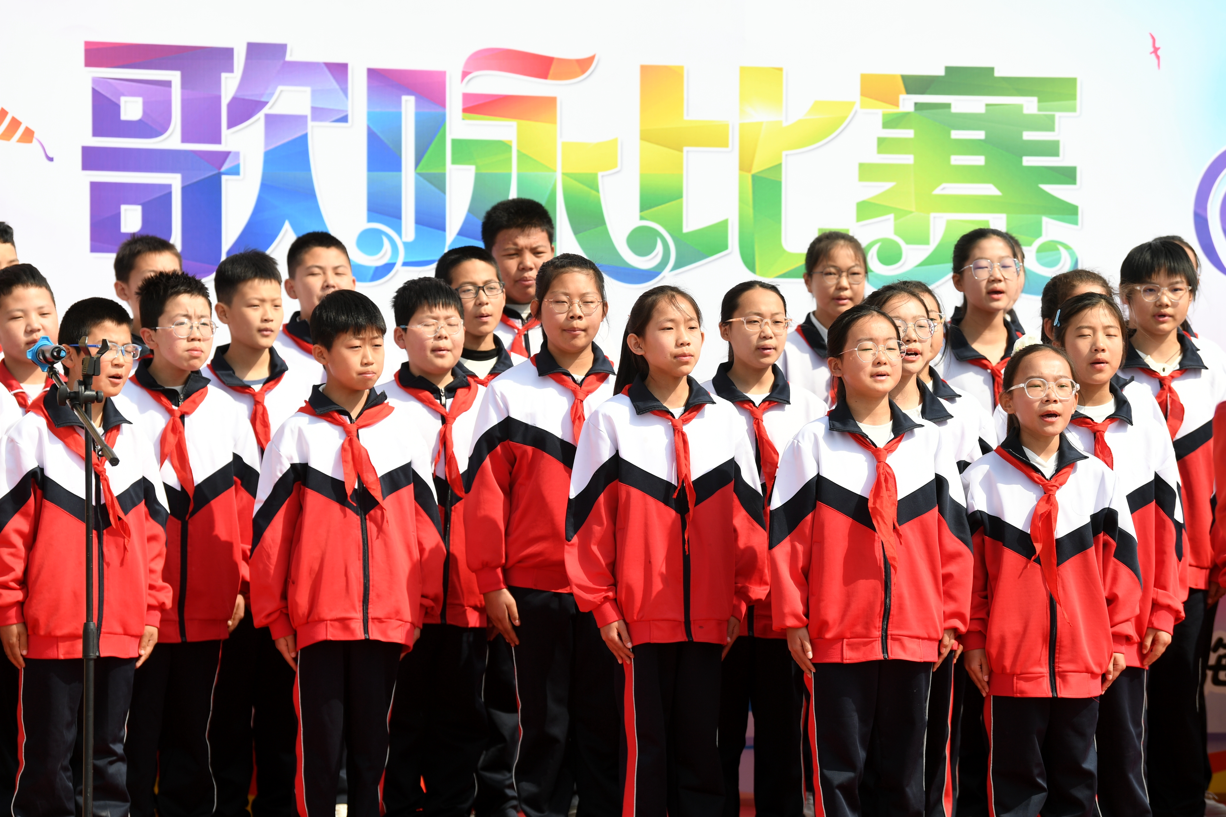 比賽現場,4個班級先后上臺合唱歌曲《我們是共產主義接班人》《七色光之歌》,學生們個個精神抖擻,歌聲嘹亮,贏得陣陣掌聲。期間,穿插朗誦《巾幗英雄趙一曼》《小蘿卜頭的故事》《雞毛信的故事》,學生們通過訴說英雄故事,重溫歷史,緬懷先烈,傳承紅色基因。全體師生合唱歌曲《沒有共產黨就沒有新中國》,將比賽推向高潮。