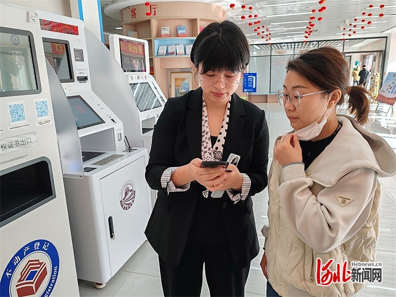 3月12日,雄安新區南文營社區黨總支書記王偉肖(左)在社區黨群服務中心幫助居民通過手機操作打印不動產權證書。(資料片) 河北日報記者 康曉博攝