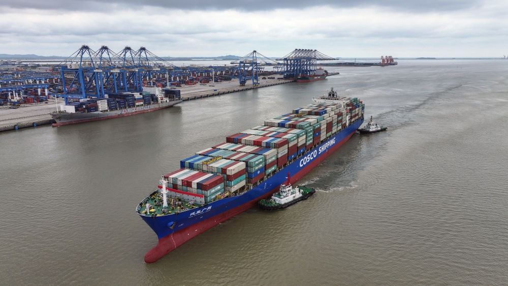 2024年5月19日,一艘海輪在廣西欽州港碼頭靠泊(無人機照片)。欽州港是北部灣港的組成部分,也是中國西南地區通往東盟的重要出海口。西部陸海新通道利用鐵路、公路、水運等多種運輸方式,由重慶一路向南,經廣西北部灣出海通達世界各地。截至2025年1月1日,北部灣港總航線達80條,其中外貿航線49條,基本實現國內主要港口和東南亞、東北亞主要港口全覆蓋。