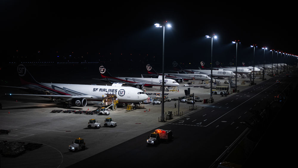 2024年5月25日凌晨,工人在湖北鄂州花湖國際機場停機坪裝卸貨物。鄂州花湖國際機場于2022年7月建成投運,是亞洲首個專業貨運樞紐機場。截至2025年1月26日,鄂州花湖國際機場已開通37條國際貨運航線和66條國內貨運航線。