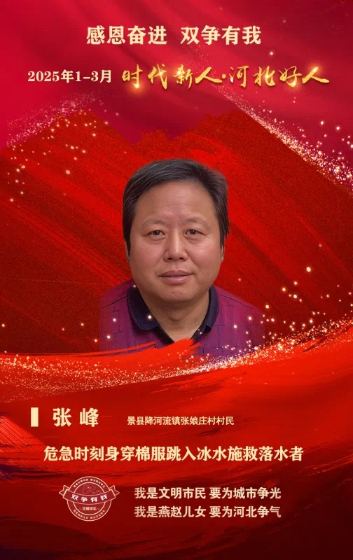 張峰,景縣降河流鎮張娘莊村村民。2024年3月21日下午,一名女子不慎落水,正在附近工作的張峰聽到有人呼救,立即停下手里的工作,毫不猶豫的跳下水中,成功救起了落水者,他用不平凡的義舉詮釋人民至上、生命至上,彰顯擔當本色。