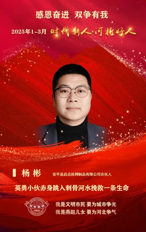 楊彬,中共黨員,安平縣啟點絲網制品有限公司合伙人。2024年12月19日下午,楊彬在河邊散步時發現有人溺水,縱身一躍跳入刺骨河水中,經過幾番不懈的努力,終于成功將落水小伙救起。發現獲救者已經沒有了呼吸,情況危急,楊彬立即對其進行人工呼吸和心肺復蘇,直至獲救者終于恢復了意識。他英雄救人的事跡在當地傳為佳話。