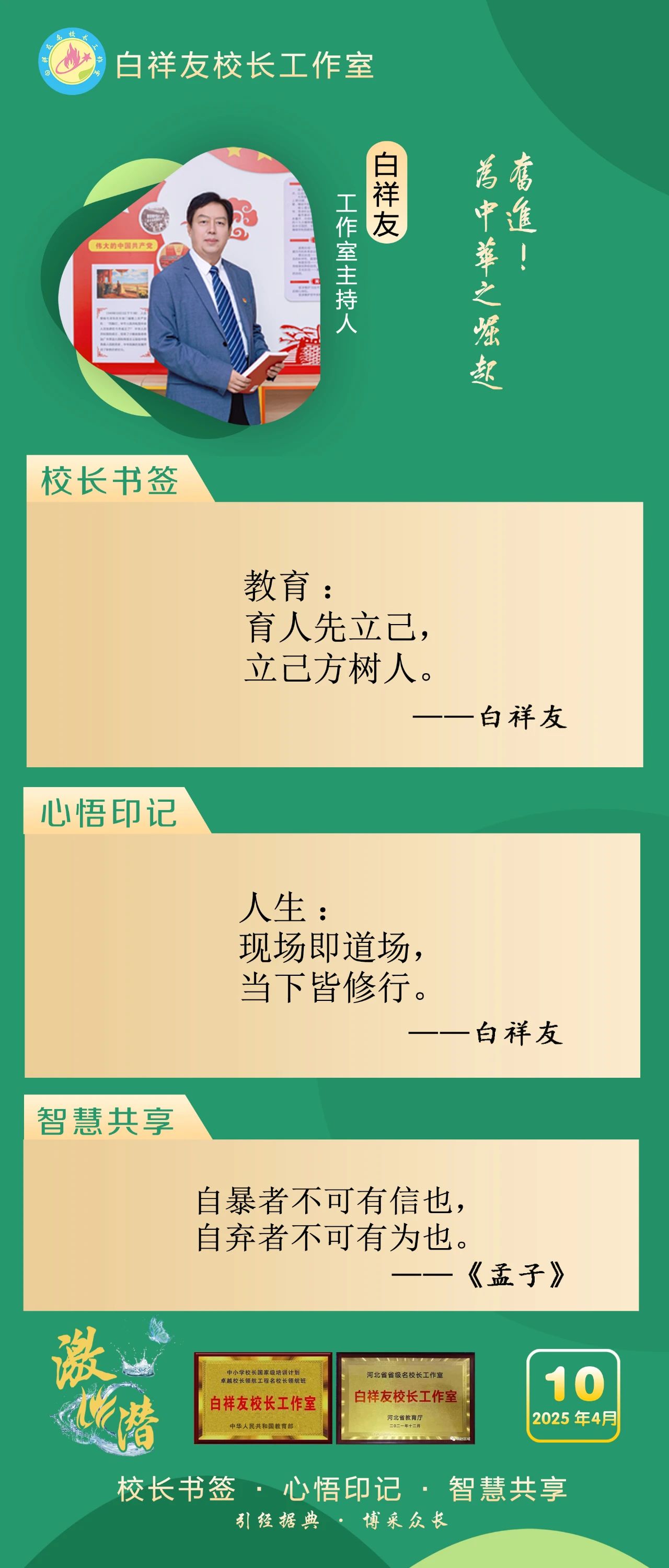 “白祥友校長工作室”成立于2019年4月,是教育部“國培計劃”中小學名校長領航工程、河北省首批名校長工作室,目前省內外成員校56個。工作室堅持“資源共享、智慧共融、互助共贏”理念,已成為思想碰撞的交流場,資源共享的品牌站,成果展示的輻射源。