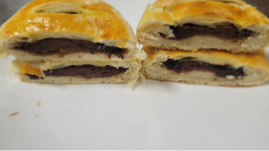 將醒好的面卷再次搟長,卷起來,再次靜置15分鐘。之后把面卷搟成圓形面片,包入適量的豆沙餡,收口朝下,輕輕按壓成扁圓形,表面刷上一層蛋液。最后放入預(yù)熱好的烤箱,以180℃烤20-25分鐘,直到表面金黃,香噴噴的老婆餅就出爐了。