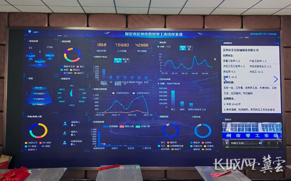 走進定州市零工市場,電子屏上招聘需求、技能交易供需、人員分布等數據清晰呈現,求職者與用工企業在此高效對接。