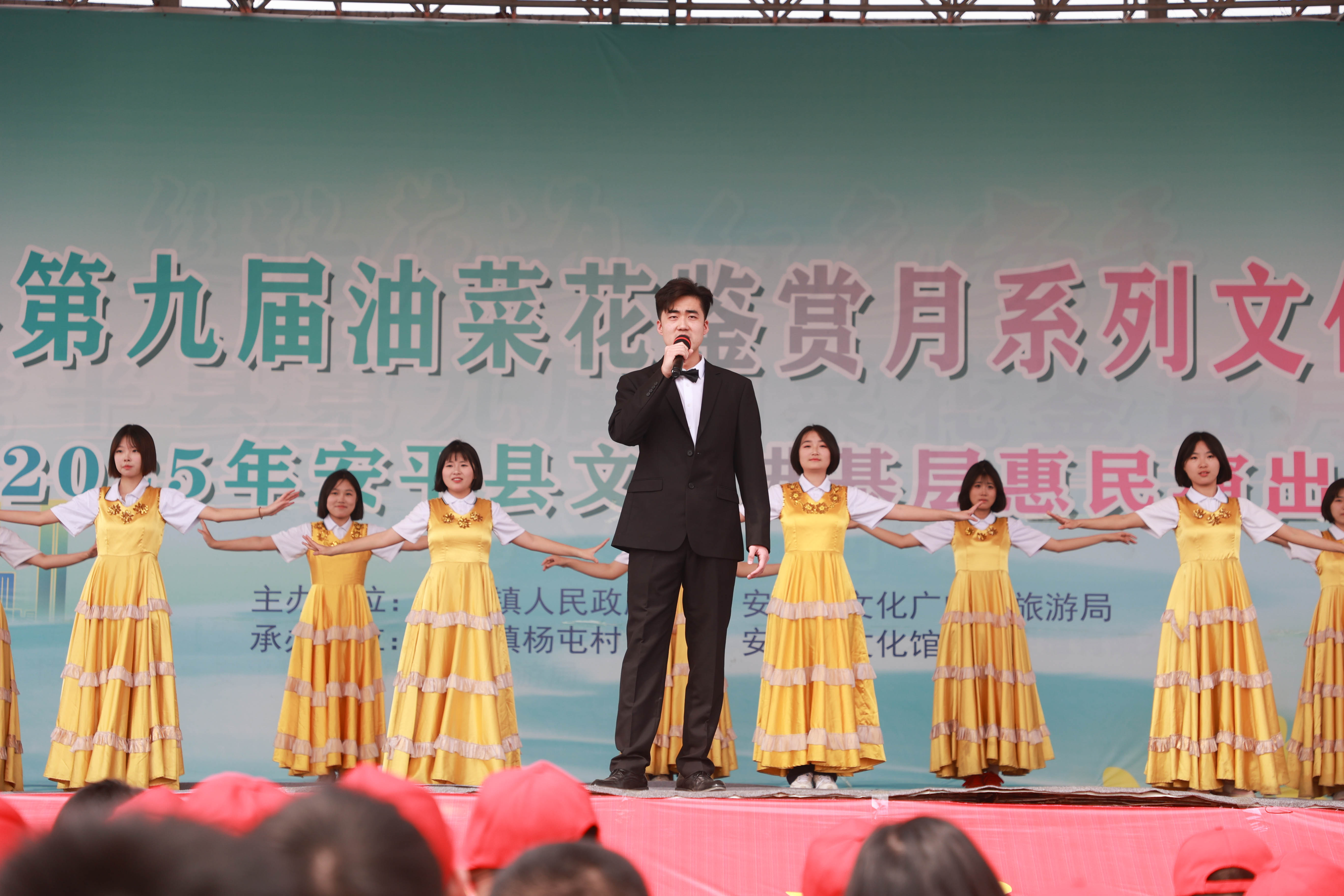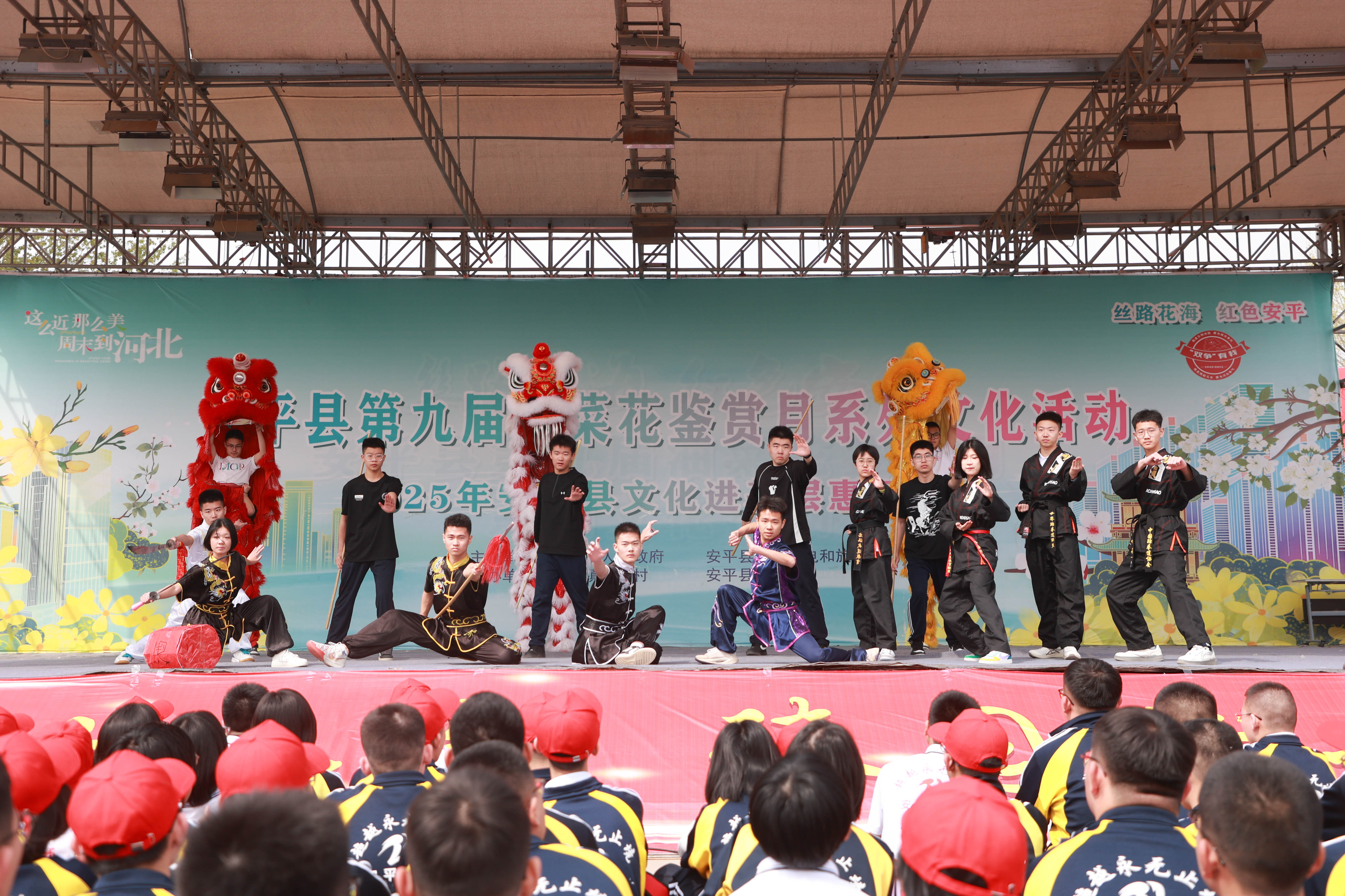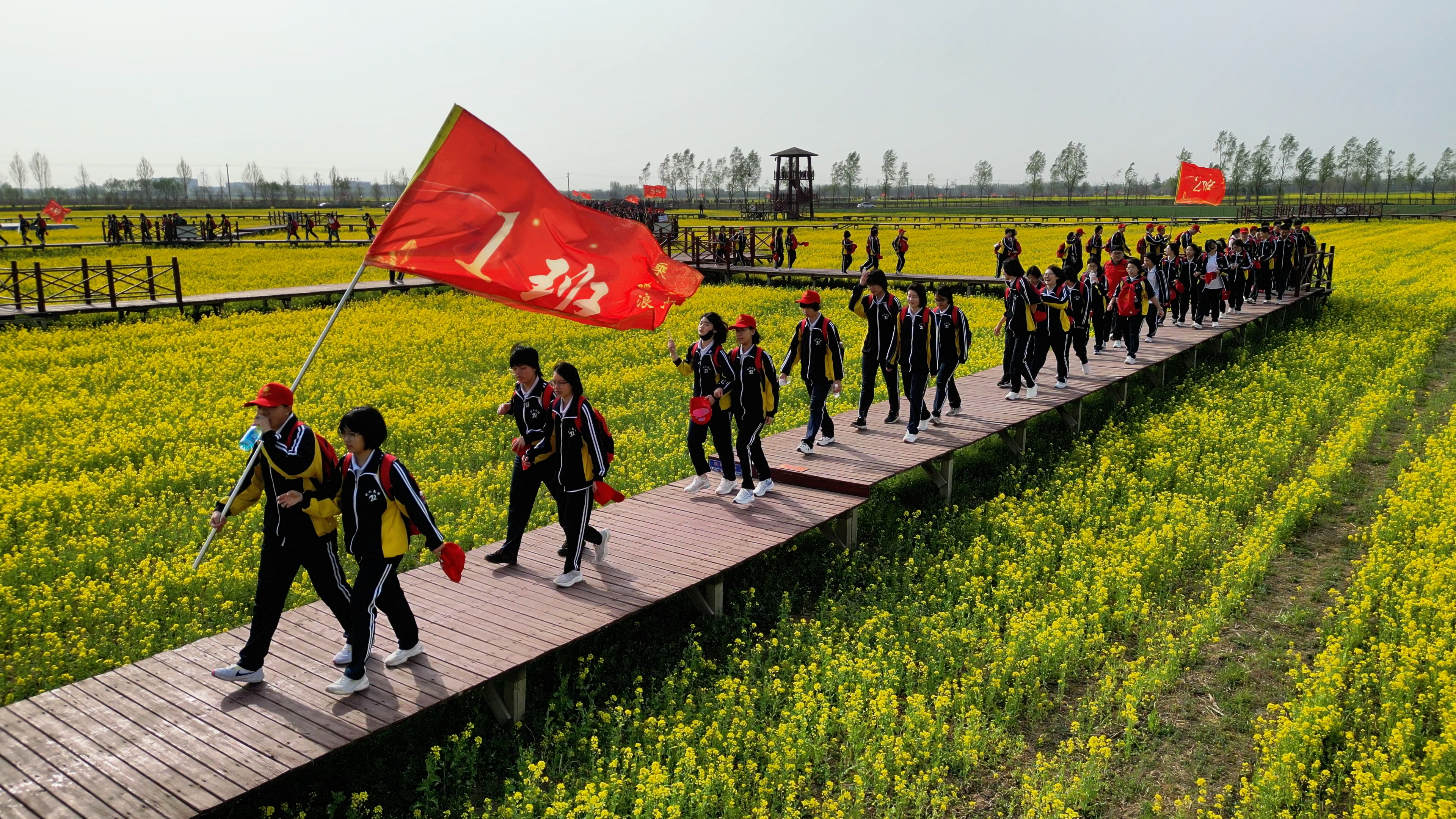 金黃花海間,青春旗幟迎風(fēng)招展。安平志臻中學(xué)的學(xué)子們穿越楊屯村油菜花田?!翱?!我們的隊伍好似奔騰的長龍!”突然響起的呼喊,讓少年們不約而同望向天際線。學(xué)生們分批在金色浪潮中通過藝術(shù)表演的形式,展現(xiàn)昂揚(yáng)向上的青春。武術(shù)社團(tuán)的功夫小子表演的《尚武雄風(fēng)》氣貫長虹,虎虎生風(fēng);古風(fēng)社團(tuán)的學(xué)生表演的古典舞《怎嘆》袖卷千年風(fēng)雅;當(dāng)《天耀中華》的旋律在人群中響起,師生們用紅歌接龍的方式向先輩致敬,歷史回音與青春吶喊在冀南大地交織共鳴。整個花海瞬間變成流動的紅色課堂。