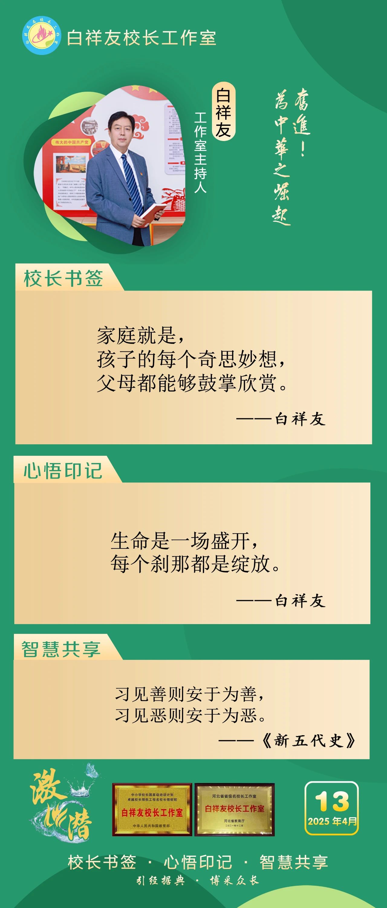 “白祥友校長工作室”成立于2019年4月,是教育部“國培計劃”中小學名校長領航工程、河北省首批名校長工作室,目前省內外成員校56個。工作室堅持“資源共享、智慧共融、互助共贏”理念,已成為思想碰撞的交流場,資源共享的品牌站,成果展示的輻射源。